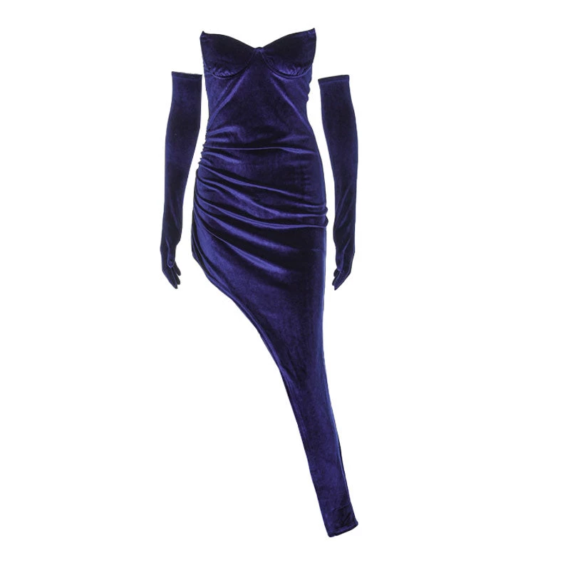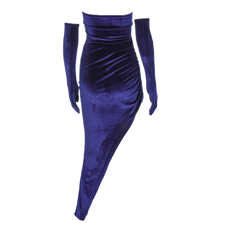 This velvet dress exudes modern elegance. Crafted with blend velvet and polyester fabric, stand out in matching gloves, featuring a sweetheart-shaped neckline along with underwire cups, a pullover design, a bodycon cut along with ruched details, and an asymmetric length accented with a dramatic thigh high slit. Find more trendy women’s cocktail party dresses or unique clothing in our boutique, and keep it glamorous with a pair of high heels and oversized hoop earrings.