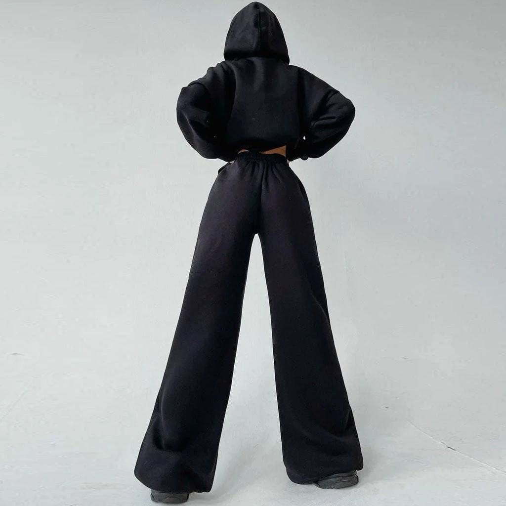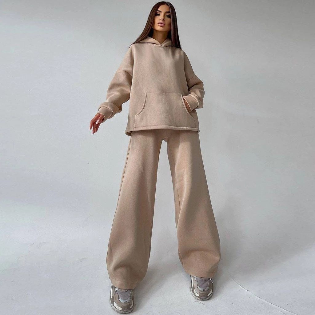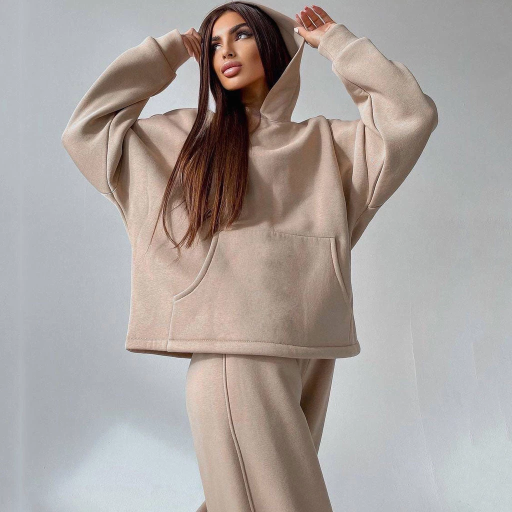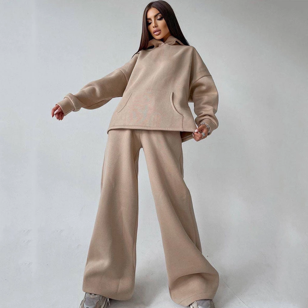 Trendy & Unique Athletic Solid Long Sleeve Wide Leg Hoodie Matching Set – Beige