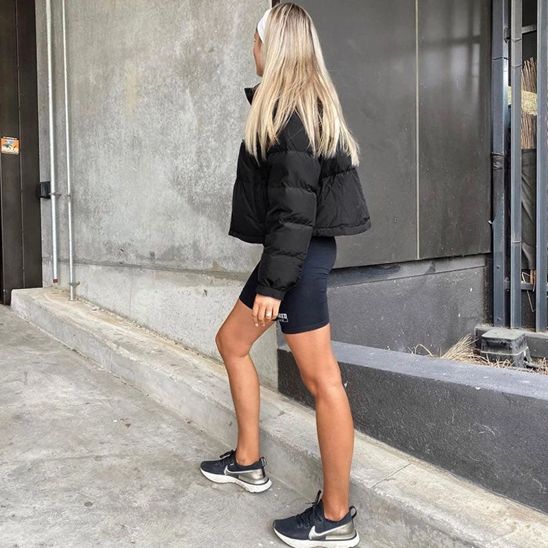Crop it on chilly days for a chic look. Made from lightweight padded fabric, cotton blend and polyester, embellished with an oversized cropped profile in solid color, featuring a boxy fit cut structured with a turn-down collar, a zip fastening to the front along with seamed pockets at sides, letter embroidery at the chest, long sleeves tailored with dropped shoulders and covered elastic cuffs, and adjustable bungees on the hemline. Find more trendy women’s crop jackets or unique clothing in our boutique, and pair perfectly with your favorite high-rise leggings or biker shorts.