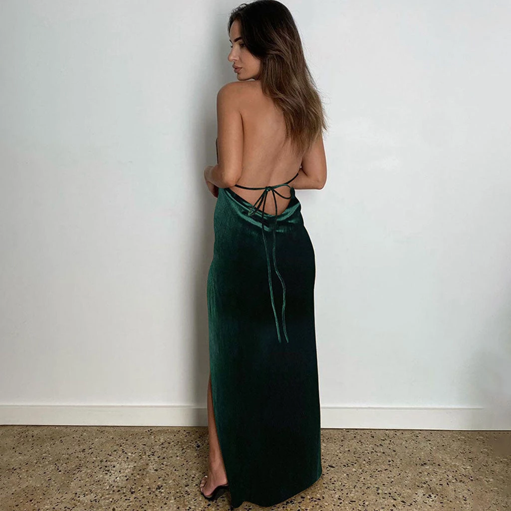 Get ready for your next night out with this party-approved slip dress. Crafted with soft velvet fabric, stand out in an alluring open back with a self-tie, featuring a draped neckline along with a chain halter strap, a figure hugging fit structured with a high-thigh slit on the side. Find more unique women’s cocktail party dresses or trendy clothing in our boutique, and team it up with sparkly butterfly heels to complete your look.
