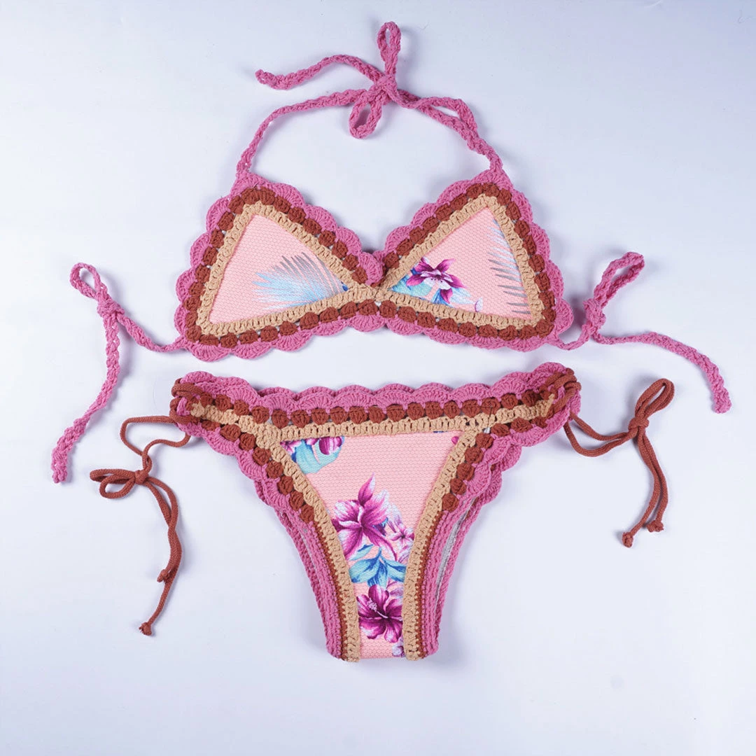 This bohemian style two-piece swimsuit in pastel color flowers is a sexy piece for your sunny beach days. Made from stretchy knitted and spandex, embellished with scalloped crocheting banding, featuring a triangle top with thick cups, a halter tie along with a back tie for a conform fit, complete a trendy boho look with a pair of low rise bikini bottom tailored with cheeky back coverage and tied strings to the sides. Find more boutique women’s bikini sets or unique swimwear to boast a brightly boho beach getaway.