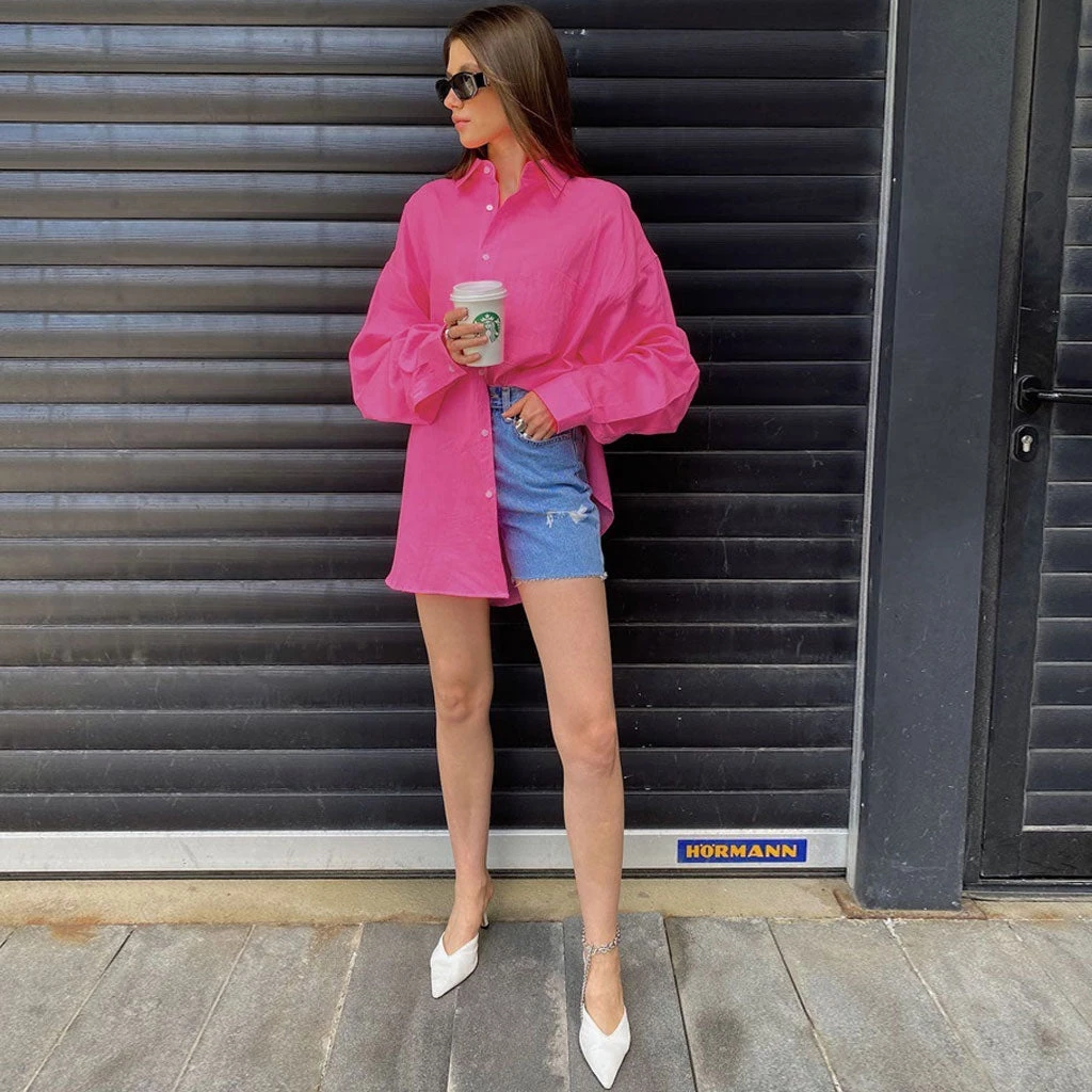 This saturated color shirt is an easy opportunity to bring some color into your life. Crafted with cotton blend and polyester, embellished with a cargo patch pocket, featuring a fold-over collar along with a button placket to the front, long sleeves tailored with dropped shoulders, an oversized fit structured with a high-low hemline. Find more unique women’s blouses or trendy clothing in our boutique, and style it with your denim, chain-link pumps, a shoulder bag and gilded jewelry for an unexpected street look.