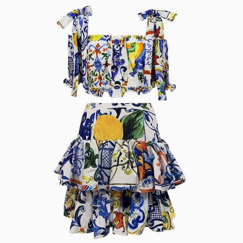 Brighten up your holiday wardrobe by dressing this bohemian multicolored two-piece set. Made of blend cotton fabric, stand out in brightly multi color floral patterns all-match, featuring a crop top in pullover styling, a frilled edging off-the-shoulder neckline along with wide straps tied on shoulders, short sleeves tailored with elasticized cuffs, complete this boho matching outfit with a pair of high rise mini skirt designed with a concealed zip fastening and distinguished with layered flounce hem at a short length. Find more unique women’s matching sets or trendy clothing for an effortless sweet & happy vacation look.