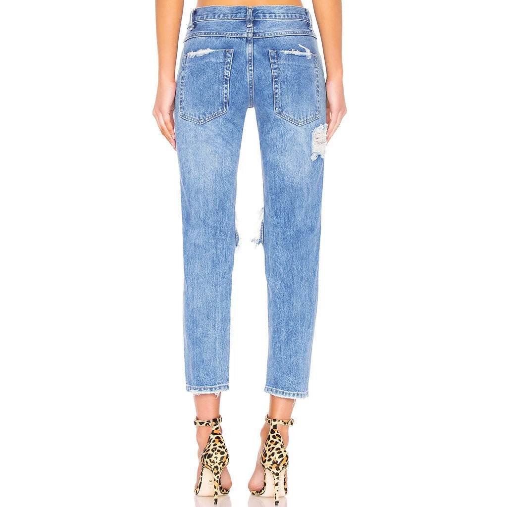 A forever-favorite denim style for this pair of jeans. Made of blend denim and polyester, stand out in dramatic holes at the knees and distressed detailing, featuring a low rise waistband trimmed with belt loops, a button closure along with a concealed zip fastening to the front, classic five pockets, a skinny-leg cut with fading details and narrow hems. Find more unique women’s jeans or clothing in our boutique, and have a trendy look with a pair of high heels and a bucket bag.