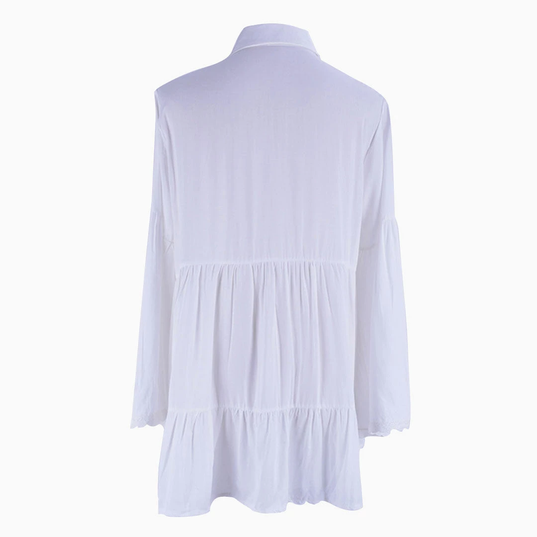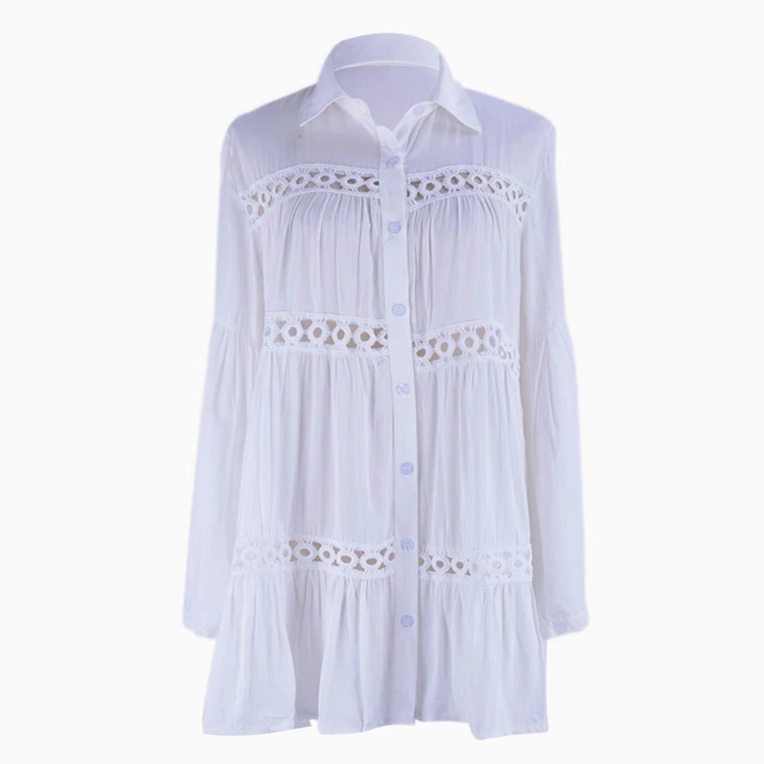 This cover up is a lovely option for your beach sunny days. Made from blend cotton fabric, stand out in swingy babydoll shape trimmed with hollow-out crocheting detailing and tiered ruching to the front, featuring a pointed collar tailed with a buttoned placket to the front, long sleeves along with flared and rickrack cuffs, and a mini length straight hem. Find more trendy women’s cover-ups or casual style clothing in our boutique, and finish a unique beach look with your favorite bikini set to let you bask in the sun without the worry of tan lines.