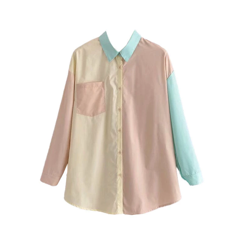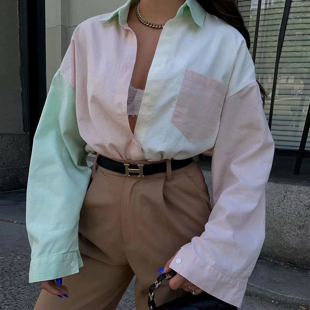 If you’re going to wear a boyfriend style button-down, this one is a nice option. Crafted with blend cotton and polyester, embellished with a slouchy profile in the shade of rainbow colors, featuring a loose fit structured with a point collar, a button placket along with a patch pocket to the front, long sleeves tailored with drop shoulder styling and buttoned cuffs, and a curve hem. Find more unique women’s shirts or trendy clothing in our boutique, and wear it on its own now and style with vintage denim and simple heels.