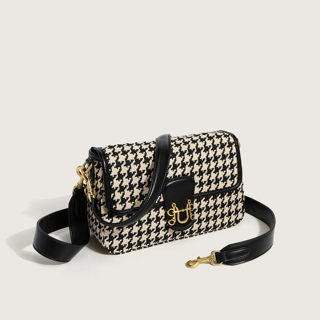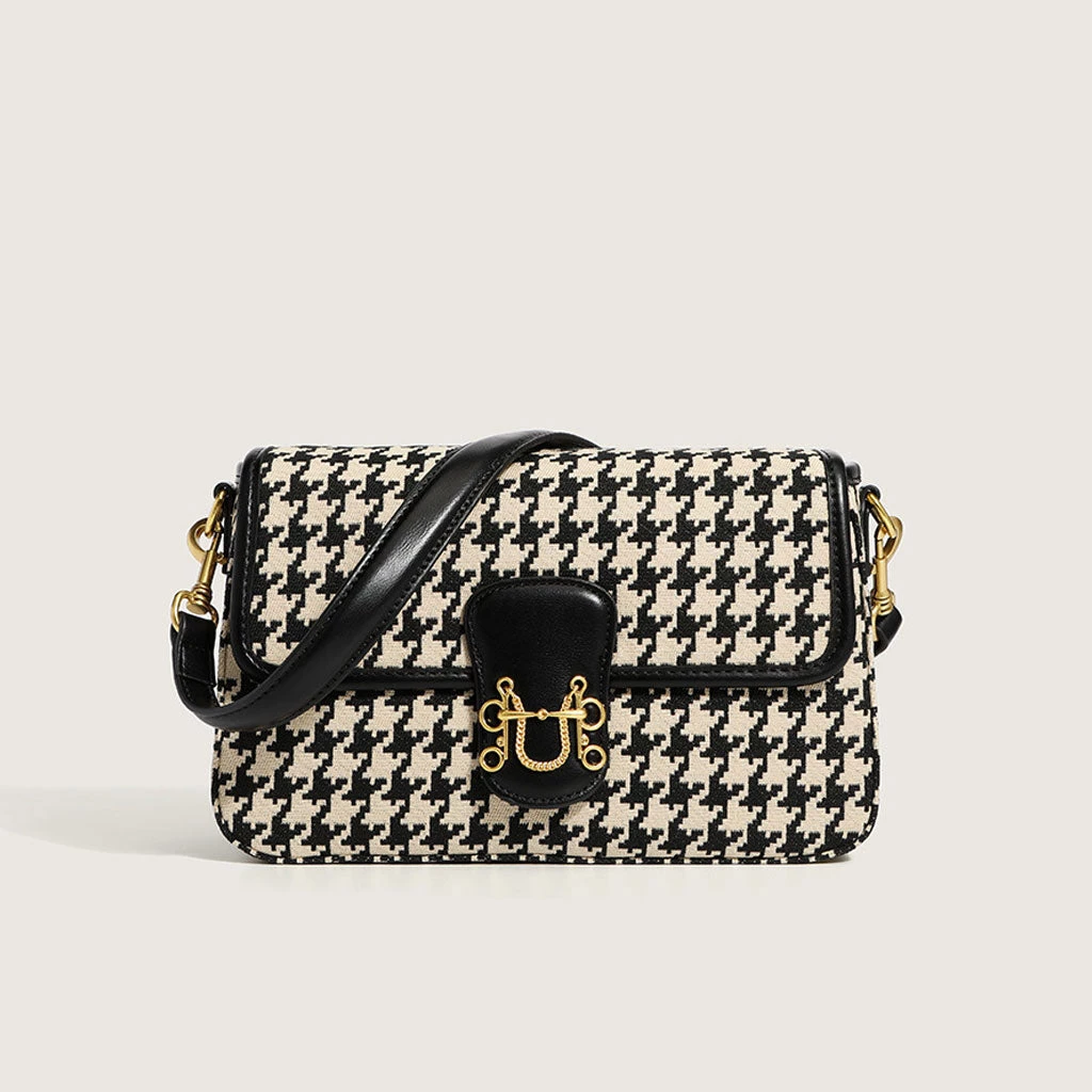 This vintage bag is a versatile accessory you’ll want to work into your daily wardrobe. Made of blend canvas and PU leather, stand out in a black and white houndstooth print overlay, featuring a structured silhouette with a magnetic buckle flap closure with a gold-hue hardware to the front, an interior zipper pocket. Find more trendy women’s shoulder bags or unique bags in our boutique, and elevate your daily outfit for a classic look.