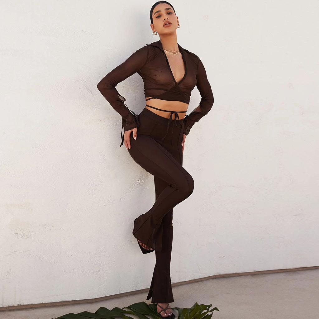 Everyone needs this sexy see-through crop blouse. Made of mesh blend and polyester fabric, embellished with an open front placket tailored with a self-tie to the front, featuring a classic open collar with a plunging neckline, long sleeves along with high slit and a self-tie at wrist , and a cropped length accented with a bare midriff cut at the waist. Find more unique women’s blouses or trendy clothing in our boutique, and style it with oversized earrings and a pair of leather jeans for a modern look.