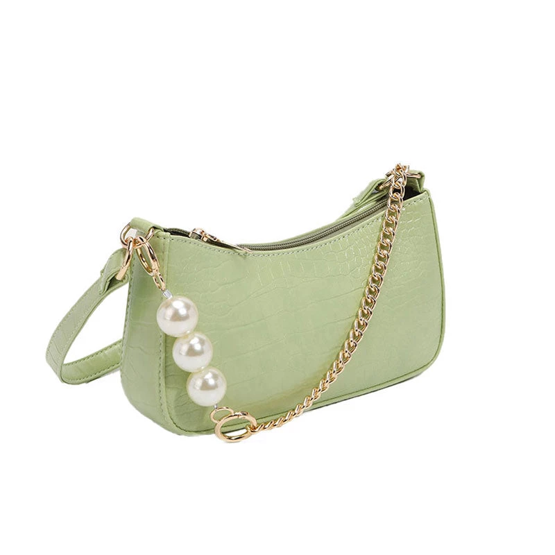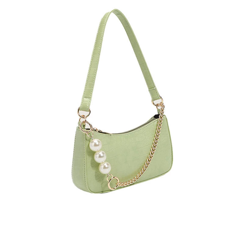 Green vibes? Why not this French style baguette bag!Made of PU leather, stand out in a fresh green hue croco-embossed effect, featuring a classic baguette silhouette with a zip closure at the top and a zip pocket interior, and a suspender shoulder strap along with a pearlized chunky chain. Find more trendy women’s shoulder bags or unique bags in our boutique, and finish a celebrity look with our chic accessories.