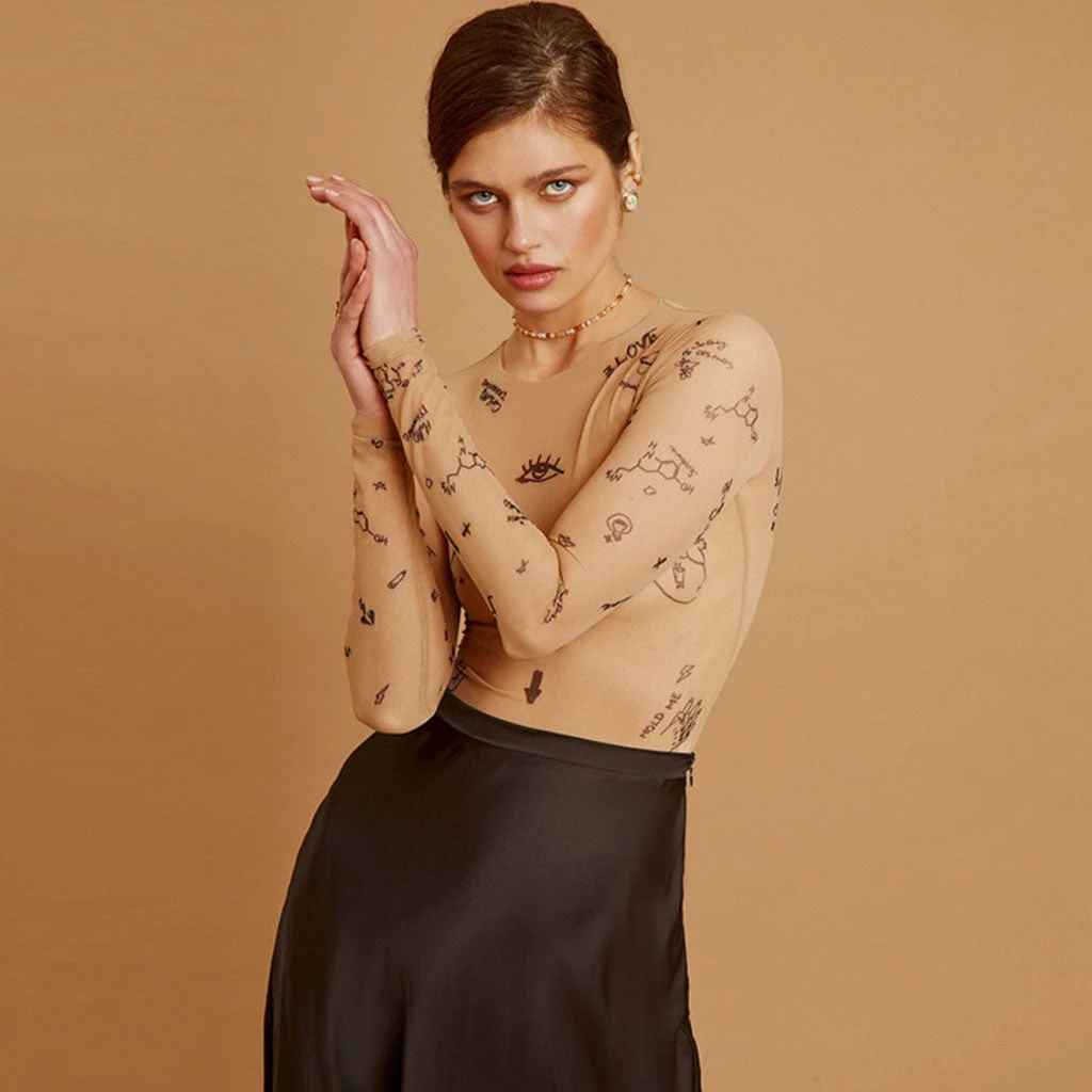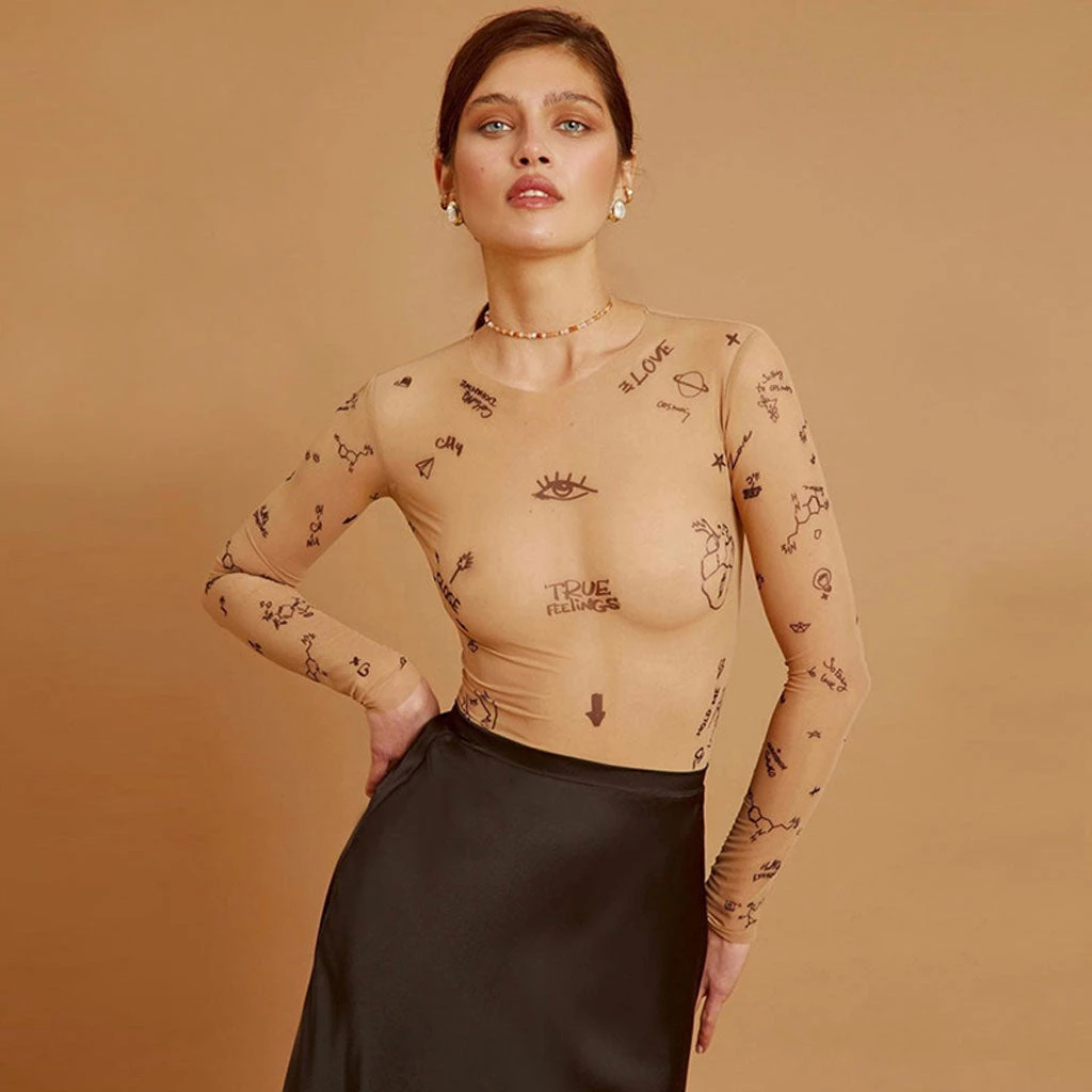 Get ready to wow everyone with this sexy see-through bodysuit. Made of blend mesh and polyester fabric, stand out in interesting scrawl patterns throughout, featuring a classic round neck tailored with long sleeves, and snap-button closures finished at the cheeky bottom. Find more trendy women’s bodysuits or unique clothing in our boutique, and pair it with everything-depending on the look you want.