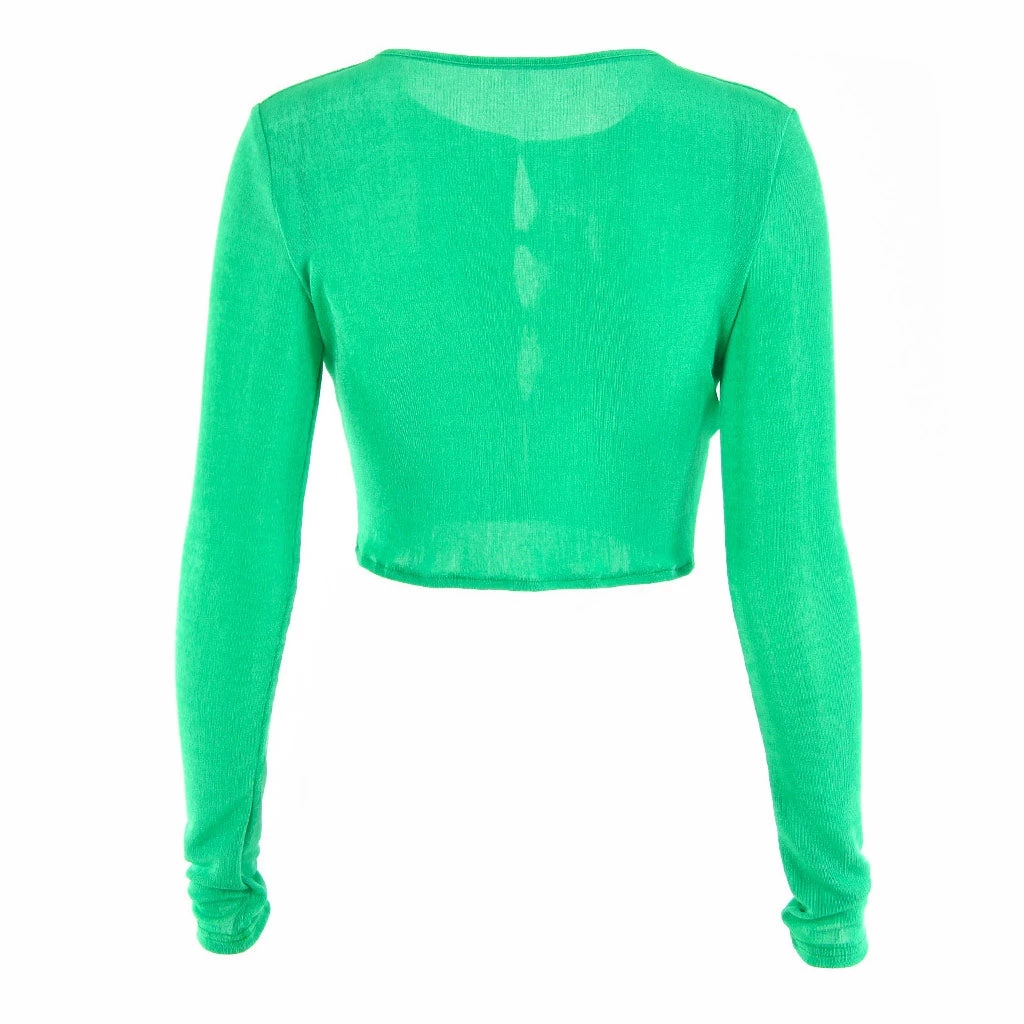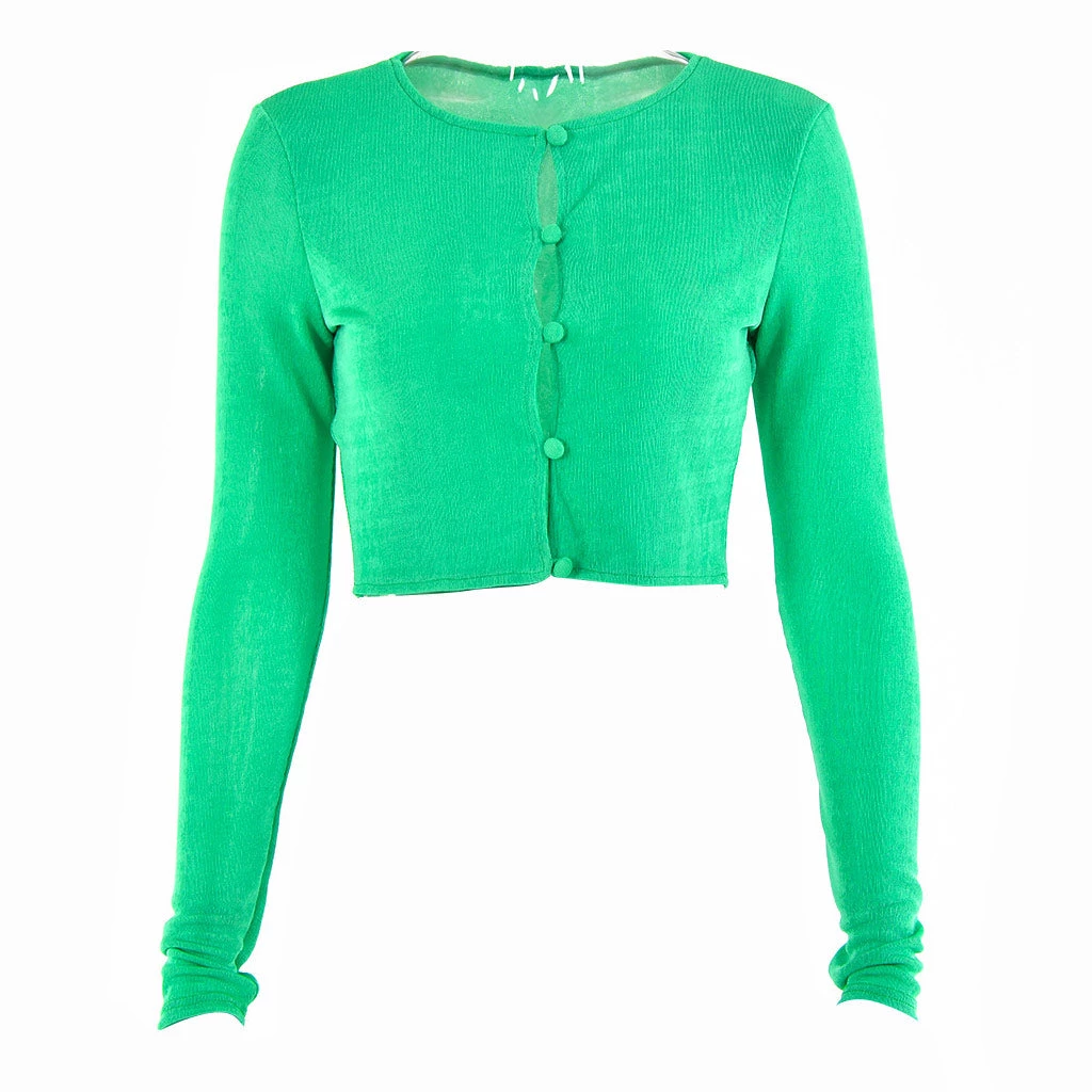 This crop button-down is indeed iconic. Made of stretchy polyester fabric in solid color, embellished with a bare midriff cut at the waist, featuring a slim fit cut structured with a crew neckline, a button placket with keyholes to the front, a long sleeve styling, and a cropped length. Find more unique women’s crop tops or trendy clothing in our boutique, and pair it with gold-tone hoop earrings and vintage denim for a vintage street look.