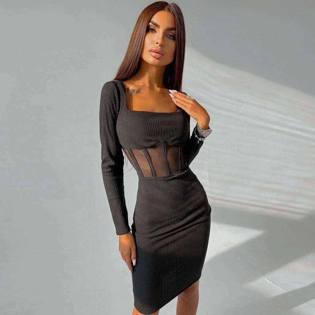 There is no reason to give up this basic but sexy knit dress. Made of soft ribbed jersey and polyester fabric, stand out in a semi-sheer profile to the waist, featuring a square neckline in a pullover design, a long sleeve styling, and ended up with mid-calf length. Find more unique women’s sweater dresses or clothing in our boutique, and wear it with a pair of high heels to complete a trendy street look.