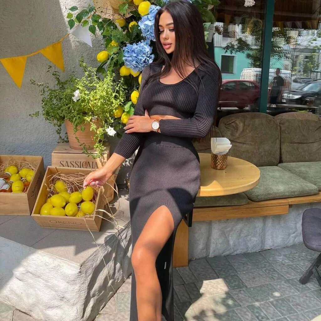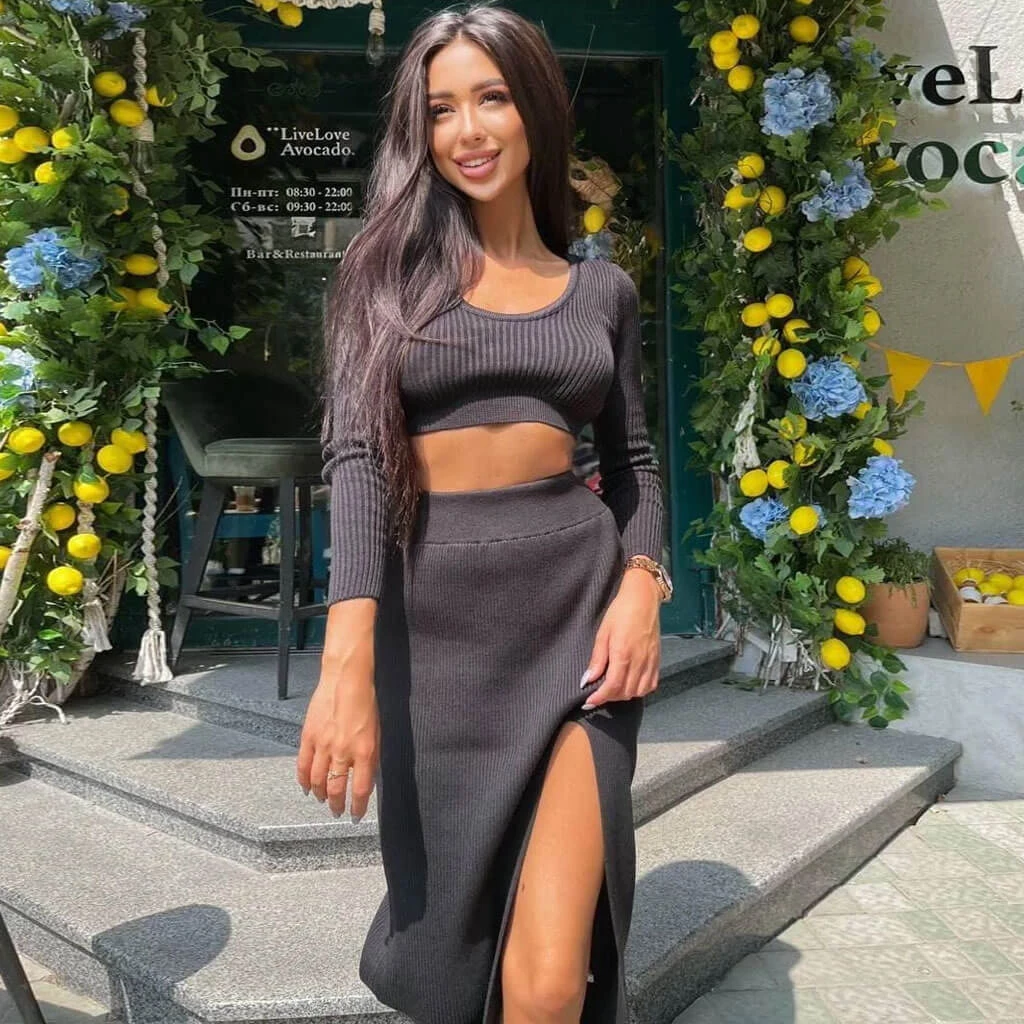 A knit version to wear with all your fancy sneakers and boots! Made of blend acrylic and polyester in solid color, embellished with an allover ribbed profile, featuring a pullover sweater structured with a scoop neck, a long sleeve styling, and a bare midriff cut at the waist, complete a street style two piece set with a high rise midi skirt accented with a thigh high slit at side. Find more trendy women’s matching sets or unique clothing in our boutique, and layer it with a flurry coat, a statement bag for a chic look in cold weather.