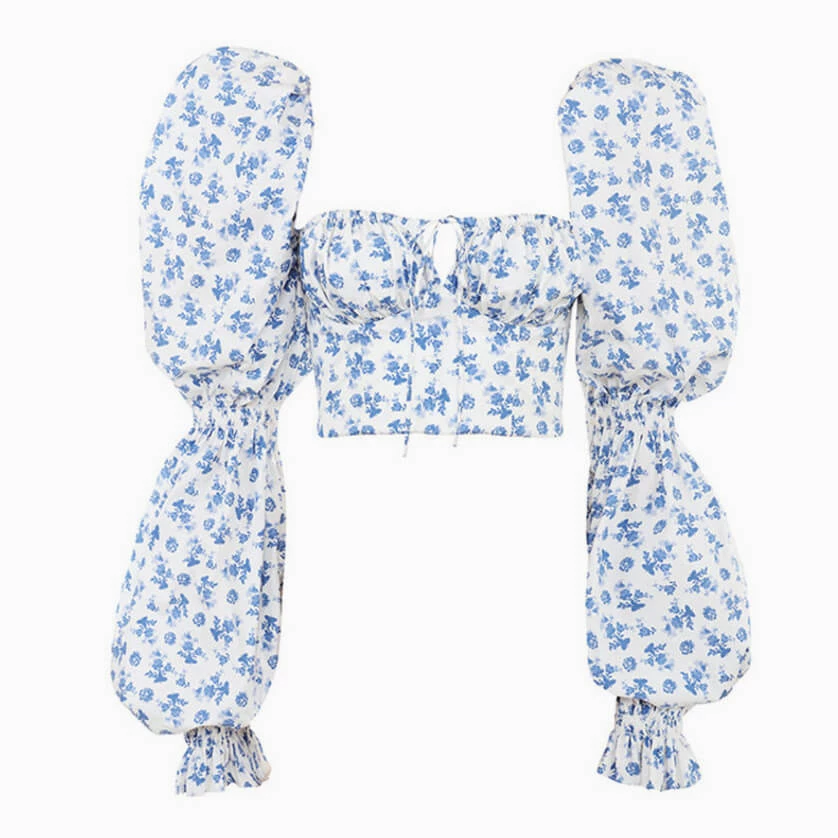 This cropped top is still trending this season. Made of cotton-blend, embellished with exaggerated puff sleeves with elasticated gathers for a playful vibe, featuring a bustier-style bodice in cropped length, a square neckline with a tie fastening with a keyhole center to the front, a slim fit silhouette in all-match flowers, exposed rear zip fastening. Find more trendy women’s tops or clothing in our boutique, and finish a unique sweet look from simple denim to sweeping skirts.