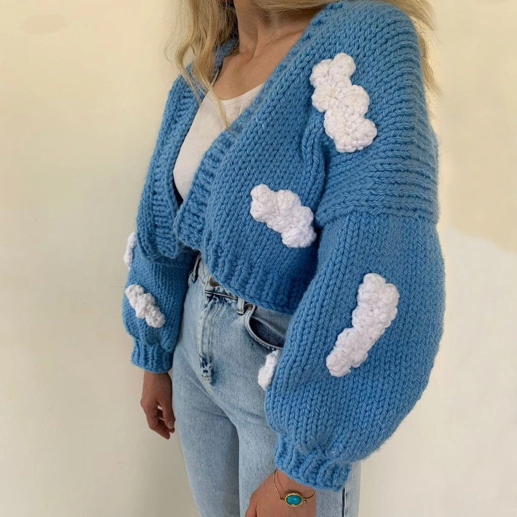 Trendy & Unique Cute Cloud Studded Bishop Sleeve Open Front Cardigan – Blue What’s New