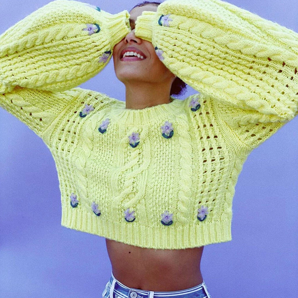 This bright-colored pullover sweater is perfect for any occasion. Crafted with blend acrylic and polyester in solid color, embellished with lilac color flowers throughout, featuring a boxy & roomy cut along with crew neckline, long sleeves tailored with dropped shoulders and chunky knit cuffs, a pointelle profile accented with chunky ribbed details, and a mini length accented with a bare midriff cut at the waist and a chunky ribbed hem. Find more trendy women’s sweaters or unique clothing in our boutique, and pair it with vintage denim for a sweet street look.