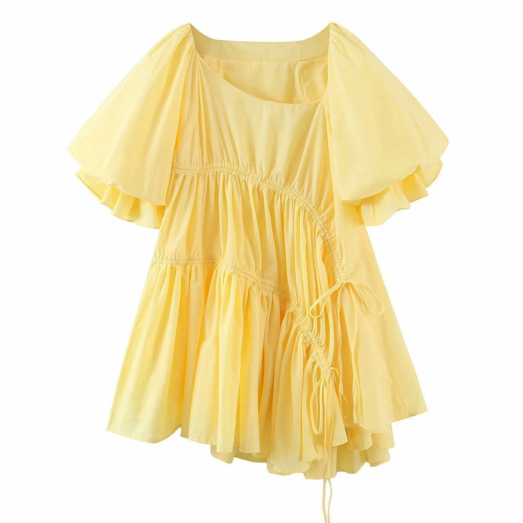 Show off your cute side with this babydoll mini dress. Made from cotton blend fabric and polyester in solid color, stand out in drawstring ties trimmed with ruched details, featuring a pullover A-Line cut structured with an asymmetrical neckline and ruffled puffy sleeves, and a mini length accented with an asymmetric hem. Find more trendy women’s dresses or unique clothing in our boutique, and complete it with a black baguette bag and a pair of orange mules for a sweet look.