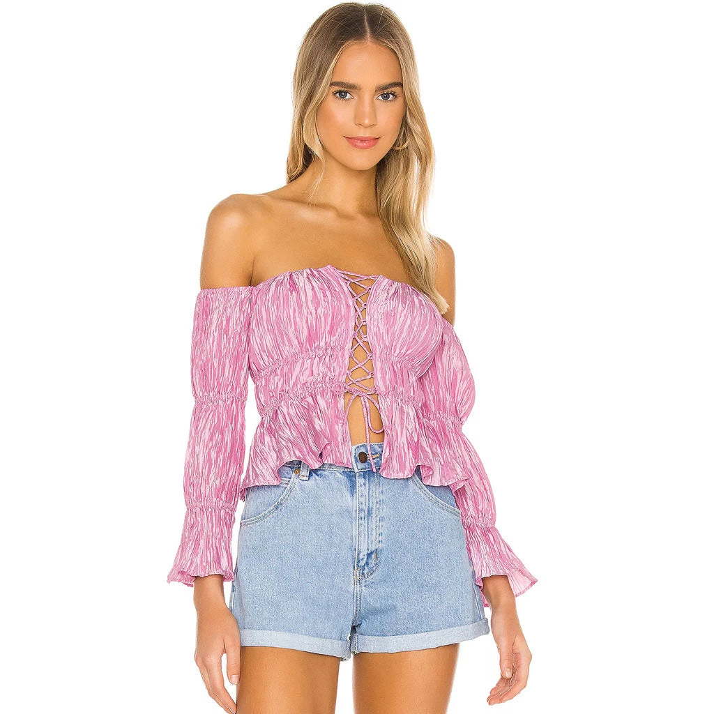 Add some bright vibes to your look with this sweet crop. Made of polyester fabric, stand out in puffy sleeves with elasticated gathers for a playful vibe, featuring a two-way neckline along with crisscross strings tied to the front, ruched details throughout, and a midriff cut with a flouncy hem. Find more unique women’s blouses or trendy clothing in our boutique, and wear a pair of sneaker when going out.