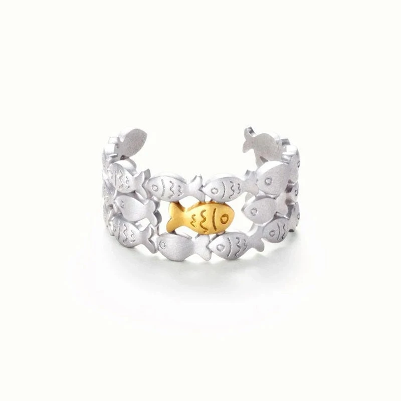 Keep yourself unique! Crafted in plated brass blend, stand out in a gold-tone fish amount the silver-tone fishes, featuring a three-layered band finished with an open end. Find more trendy women’s rings and jewelry in our boutique, and wear solo or stack with our accessories for a cute look.