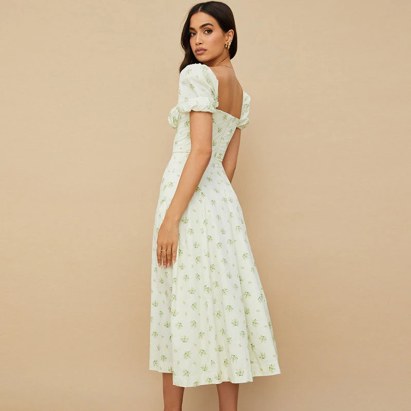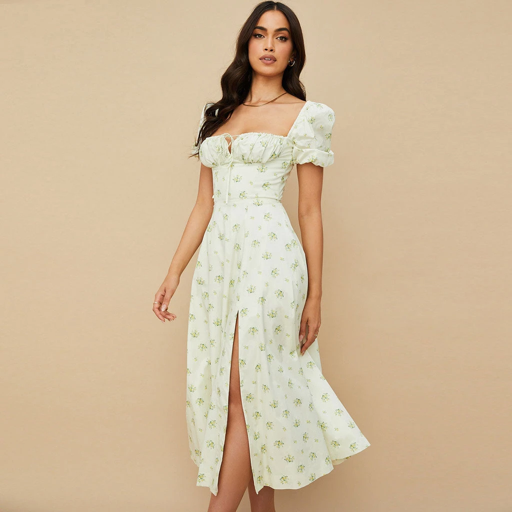 Go ahead and get a little risky with this cute and sexy printed sun dress. Made from cotton blend fabric and polyester, stand out in flower patterns throughout, featuring a square neckline structured with a ruched trim drawstring tie and a keyhole at the chest, a fit-and-flare cut tailored with covered elastic puffy sleeves, a rear zip fastening, and the particularly long length accented with a dramatic side slit. Find more unique women’s summer dresses or trendy clothing in our boutique, and complete a sweet French style with high sandals in sunny days or toss on a jacket and heeled boots in fall and winter.
