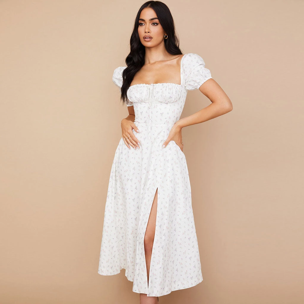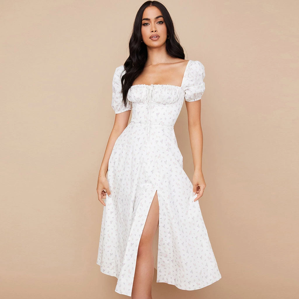 Go ahead and get a little risky with this cute and sexy printed sun dress. Made from cotton blend fabric and polyester, stand out in flower patterns throughout, featuring a square neckline structured with a ruched trim drawstring tie and a keyhole at the chest, a fit-and-flare cut tailored with covered elastic puffy sleeves, a rear zip fastening, and the particularly long length accented with a dramatic side slit. Find more unique women’s summer dresses or trendy clothing in our boutique, and complete a sweet French style with high sandals in sunny days or toss on a jacket and heeled boots in fall and winter.