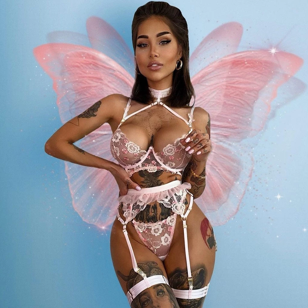 This exposed bra set is iconic indeed. Made from sheer tulle, stretchy lace and nylon, stand out in embroidered intricate flowers presented in sweet pink color, featuring unpadded underwire balconette cups along with slender adjustable shoulder straps, multi straps along with adjustable S-hoop closures to the rear, complete an eye-catching lingerie outfit with a high waist ruffle garter tailored with a s-hoop closure to the rear and adjustable garter straps, and a pair of string thong along with scalloped edge. Find more unique women’s bra sets or trendy clothing in our boutique to ensure a glamorous wear for your daily life.