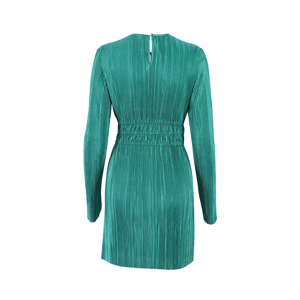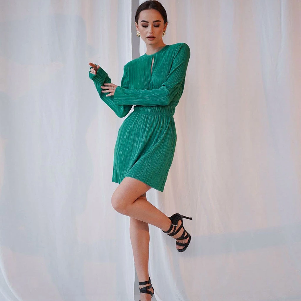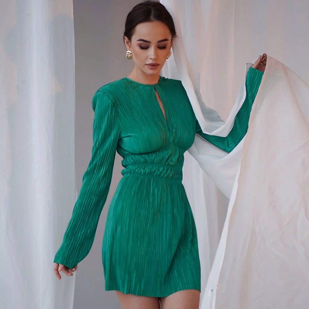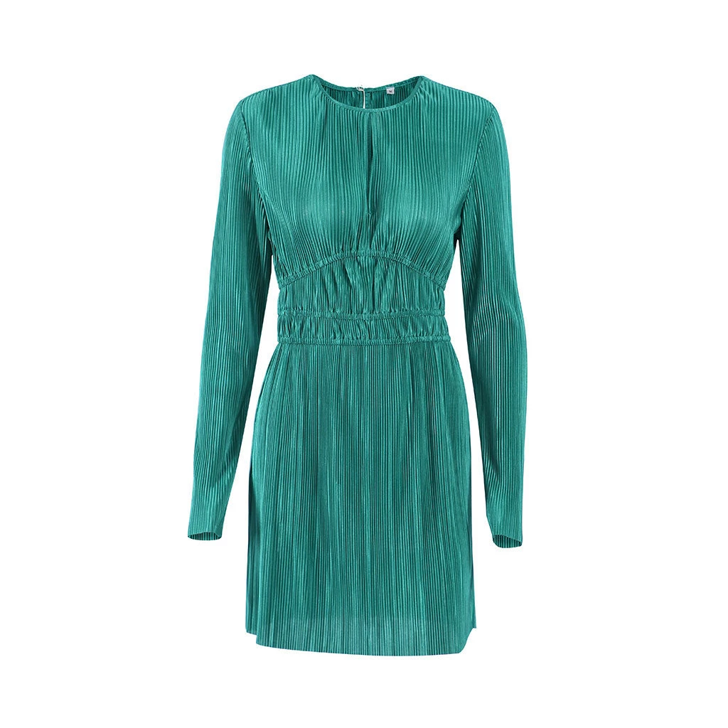 This French style mini dress will be an eye-catching addition to any resort wardrobe. Made from polyester fabric in solid color, stand out in a textured silhouette, featuring a crew neckline structured with a button closure to the rear, seductive keyholes to the front and back, a covered elastic waistband with frill details, a long sleeve styling in a pullover design, and ended up with a mini length. Find more unique women’s cocktail party dresses or trendy clothing in our boutique, and wear it with a pair of high heels, a baguette bag and statement earrings for a sleek look.