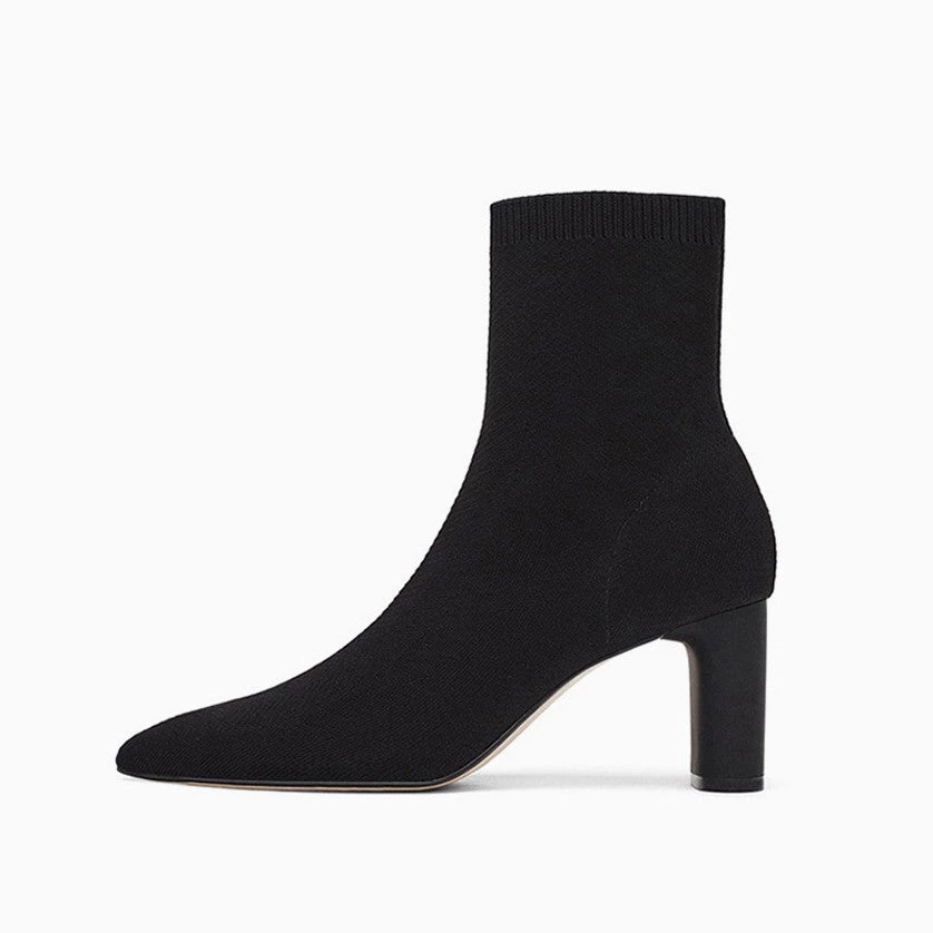 This pair of slim boots is a sleek everyday piece in the autumn winter season. Crafted with stretch knitted and rubber, stand out in metallic-effect chunky heels, featuring a narrow calf height in slip-on styling, sharp pointed toes to the front in textured effect, and a rubber outsole. Find more unique women’s boots and trendy shoes in our boutique, and wear the stylish boots an all-black ensemble for a timeless look – Heel height: 7 cm.
