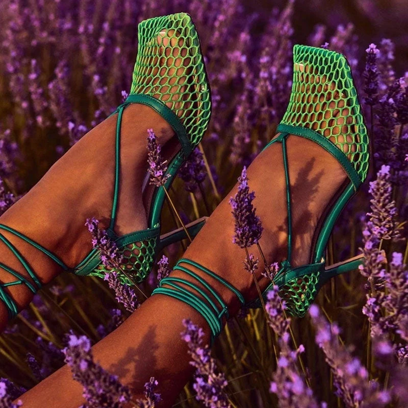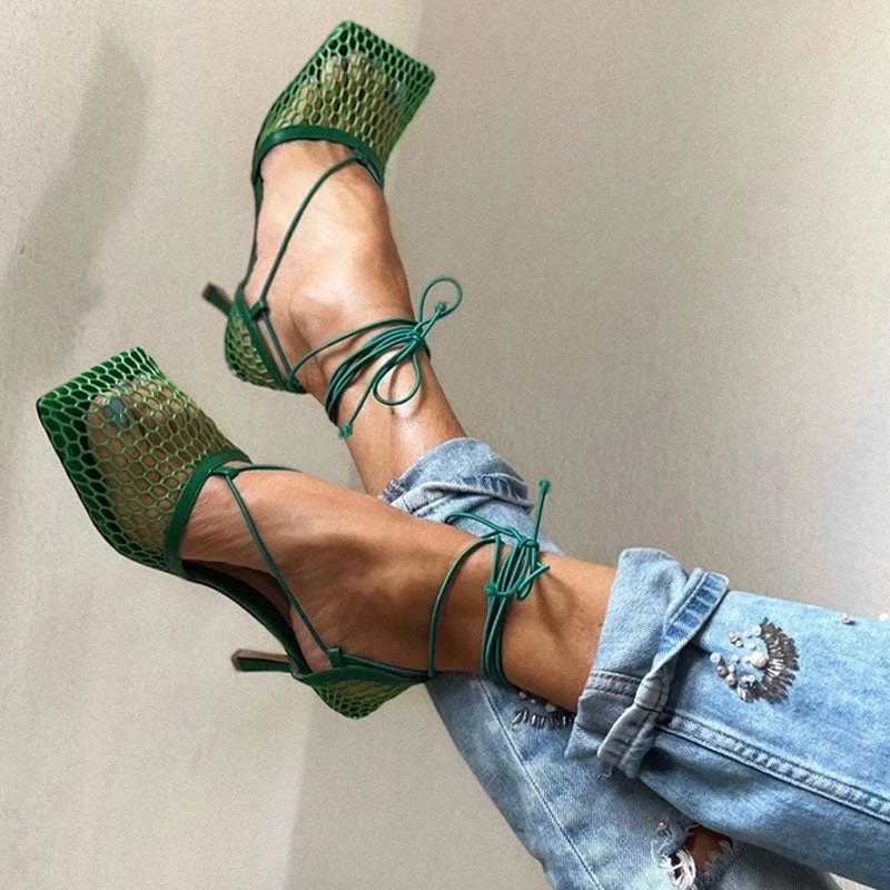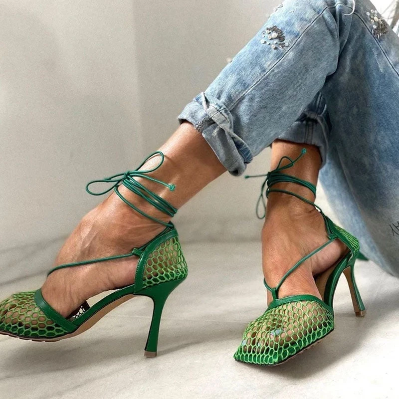 Saturated shades continue to blossom and this pair of high-impact colored pumps is already winning. Crafted with blend PU leather, mesh and rubber, stand out in hollow-out mesh effect at the top, featuring a lace-up styling, a square toe to the front, lightly cushioned footbed, a sky-high heel, and finished with rubber heel cap. Find more unique women’s sandals and trendy shoes in our boutique, and finish with everything from chic jeans and maxi dresses to create an unexpected yet incredible look – Heel height: 8.5 cm.