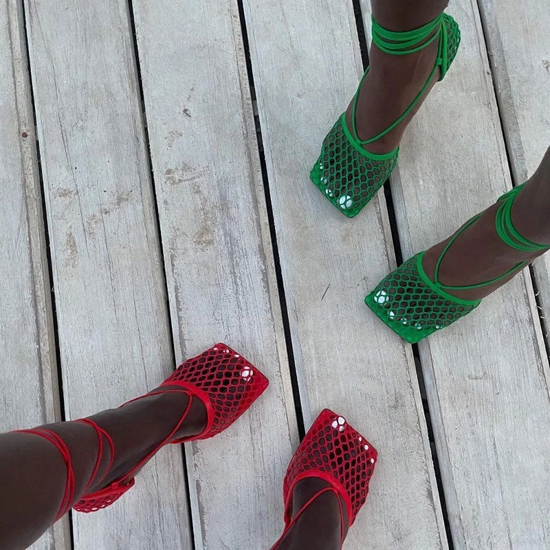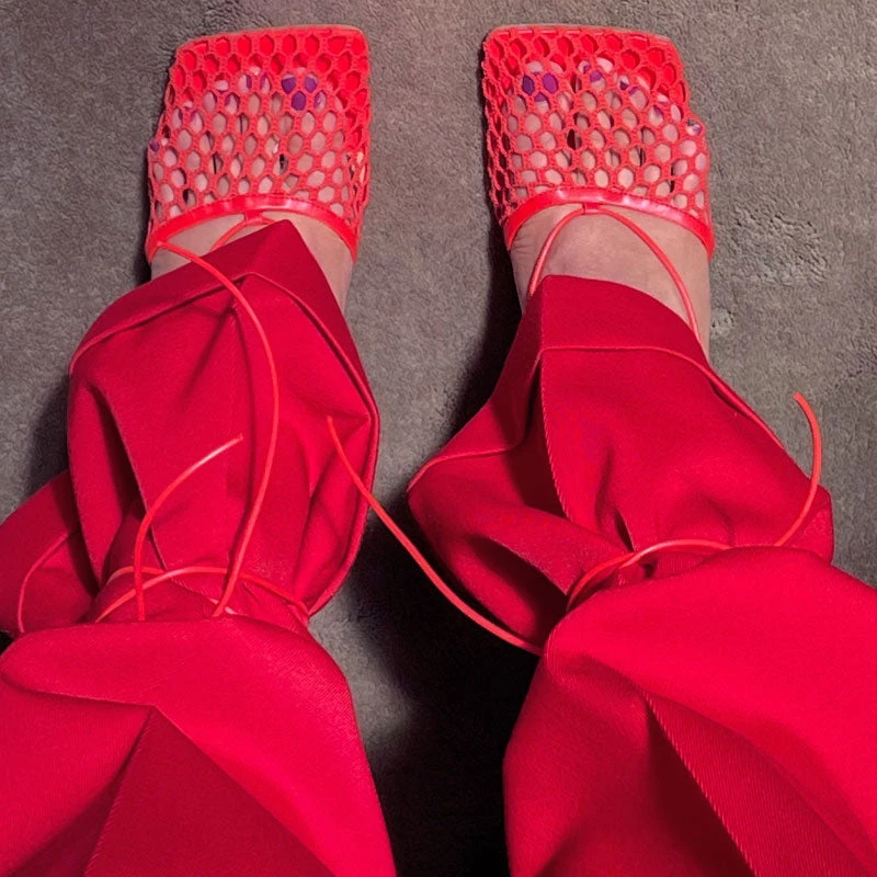 Saturated shades continue to blossom and this pair of high-impact colored pumps is already winning. Crafted with blend PU leather, mesh and rubber, stand out in hollow-out mesh effect at the top, featuring a lace-up styling, a square toe to the front, lightly cushioned footbed, a sky-high heel, and finished with rubber heel cap. Find more unique women’s sandals and trendy shoes in our boutique, and finish with everything from chic jeans and maxi dresses to create an unexpected yet incredible look – Heel height: 8.5 cm.