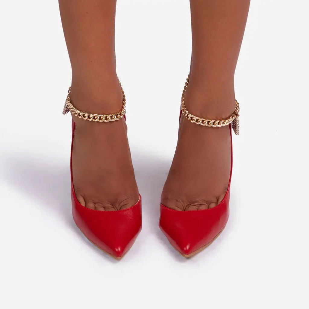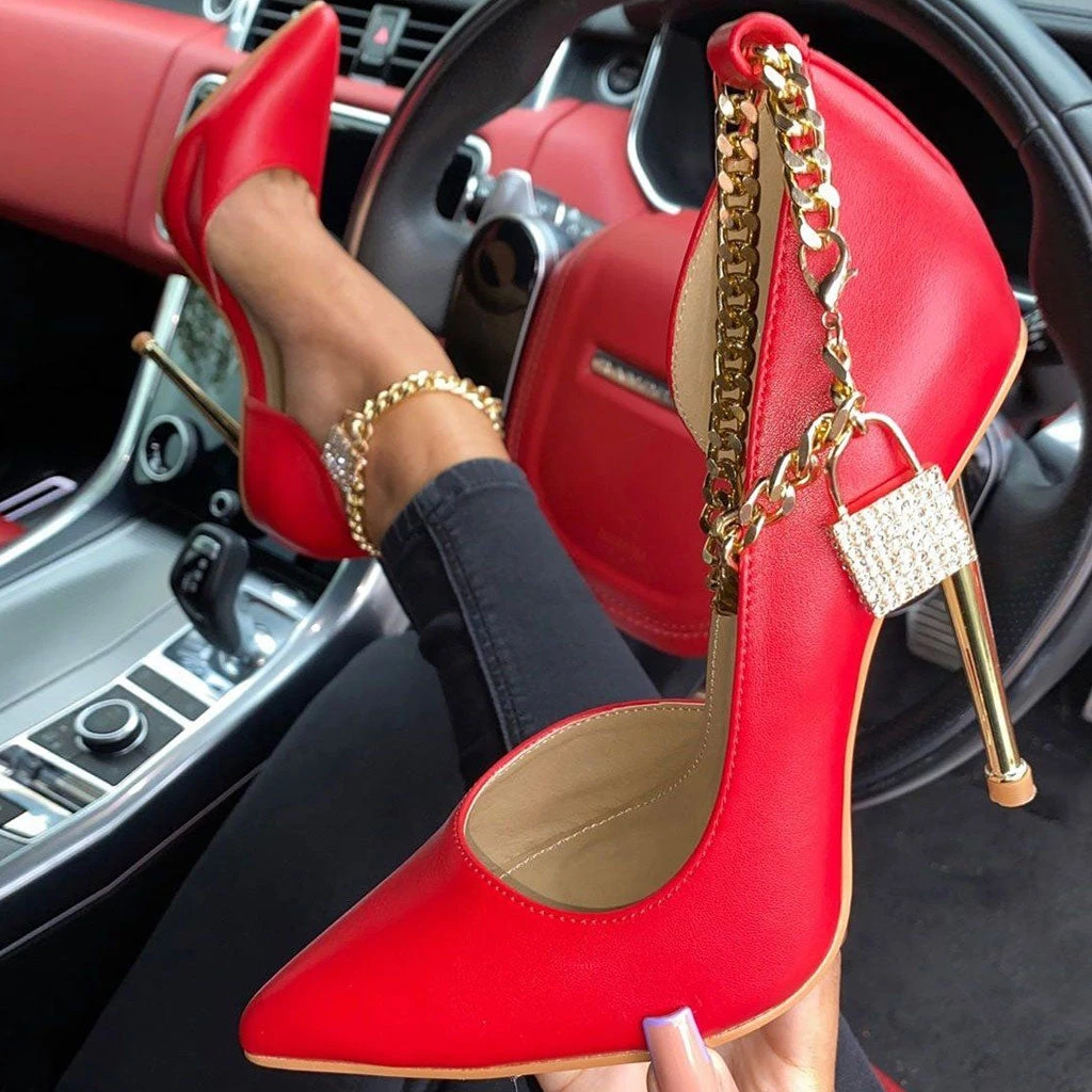 This pair of modern high heels is a must-have when you join the party. Made of PU leather and rubber, stand out in a glitter chain strap with a gold lock, featuring sharp pointed toes to the front, lightly cushioned footbeds, high heels, and finished with rubber heel caps. Find more trendy women’s high heels and unique shoes in our boutique, and wear them with a sleek dress and enjoy how flattering as you walk – Heel height: 11.5 cm.