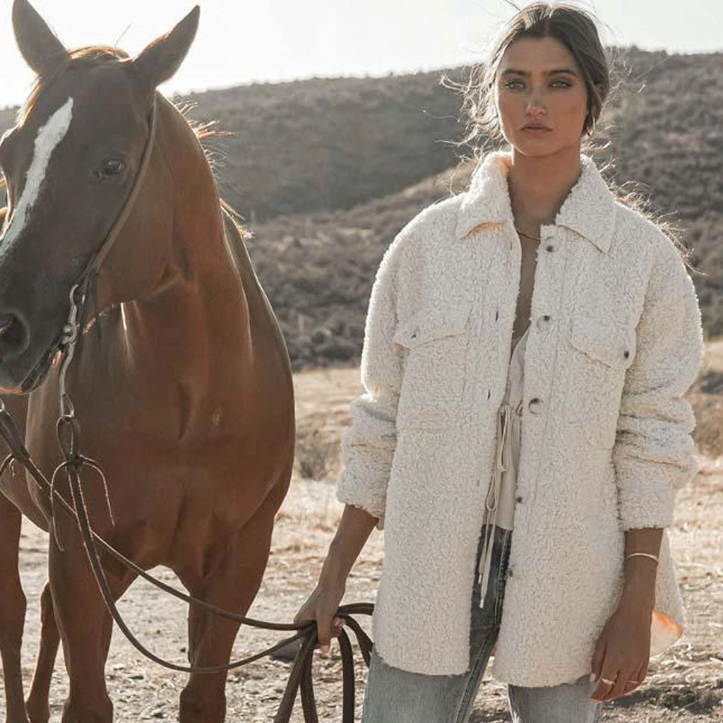 This shirt jacket is a key layering piece for this fall and beyond. Made from faux fur and polyester, embellished with a shaggy shirt profile in the shade of beige color, featuring a loose fit cut structured with a point collar, a button placket to the front along with twin flap pocket at the chest, long sleeves tailored with seamed cuffs, and a curved hem. Find more trendy women’s shackets or clothing in our boutique, and layer perfectly with a white turtleneck underneath and vintage denim for a trending winter look.