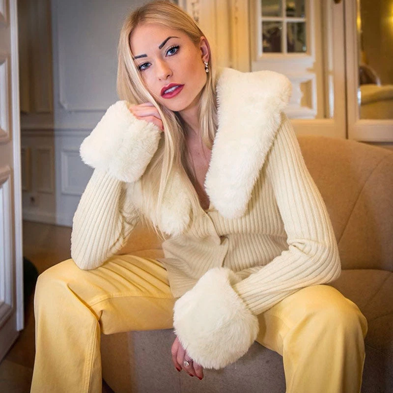 You’ll look warm and unique in this fluffy cardigan. Made of faux fur, soft jersey fabric and polyester, embellished with exaggerated furry trims on the neckline and cuffs, featuring an a slim fit cut tailored with a V neckline and a button placket to the front, a long sleeve styling, and ended up with a regular hem. Find more unique women’s cardigans or trendy clothing in our boutique, and go for high rise denim and platform shoes for a vintage winter look.