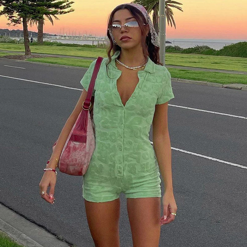 This unique playsuit makes getting dressed on a warm day so easy. Made from soft cotton blend, stand out in embossed letters overlay, featuring a fold-over collar along with a button placket to the front, a slim fit tailored with short sleeves, and a thigh length bottom tailored with seamed hems. Find more trendy women’s rompers or unique clothing in our boutique, and pair with sneakers, chunky necklaces and a shoulder bag for a street look.