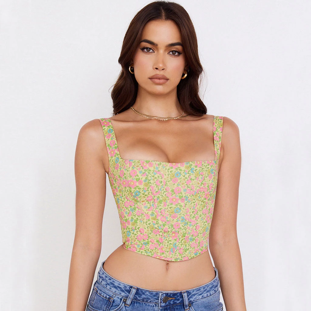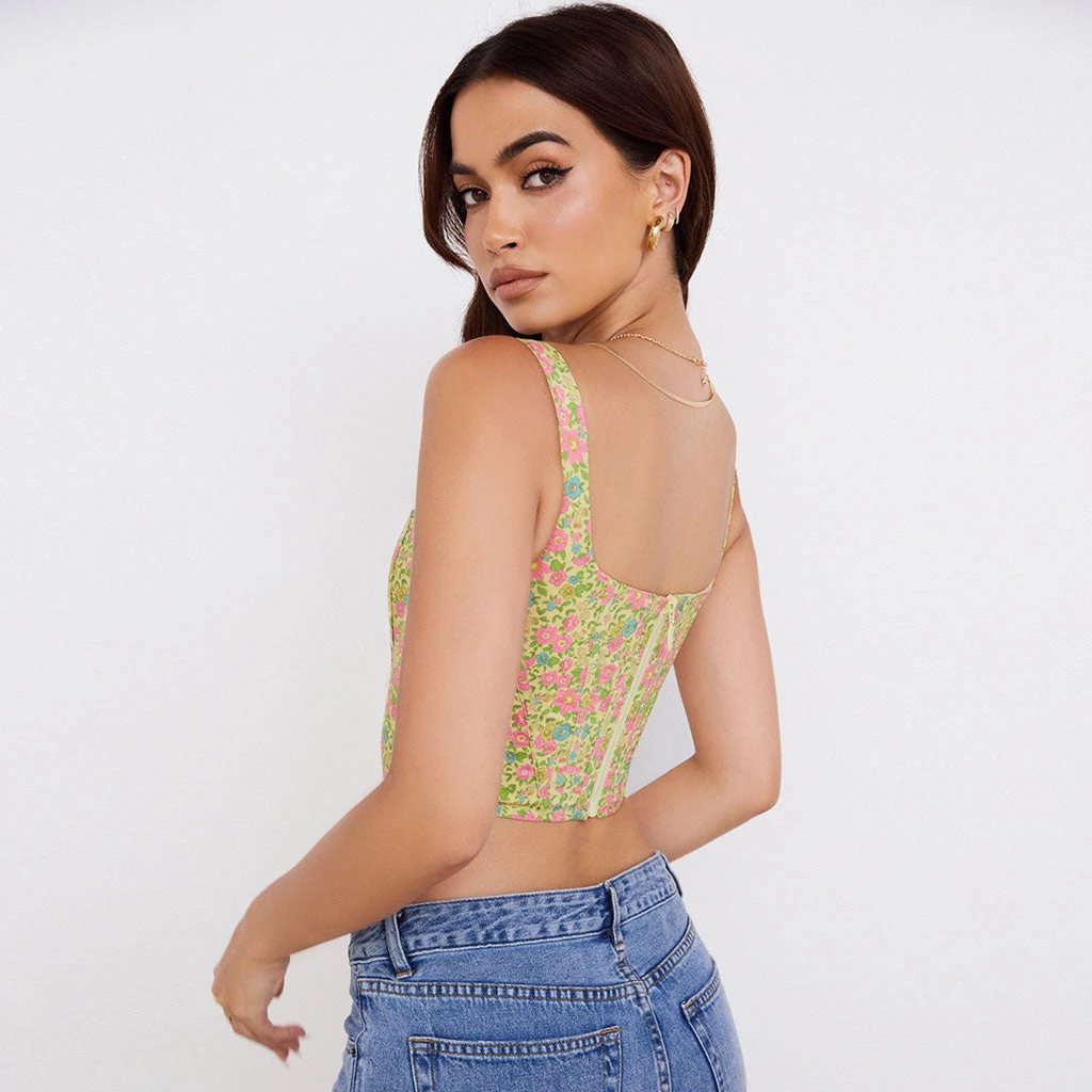 Bring this pretty floral printed corset top to your wardrobe this season. Made of polyester fabric in bright color, stand out in a bare midriff cut at the waist, featuring a square neckline tailored with elastic wide straps over shoulders, a slim fit cut structured with boned seams and a rear zip fastening, and a crop length accented with an curved hem. Find more unique women’s corset tops or trendy clothing in our boutique, and accessorize with statement-making earrings and a pair of our distressed wide jeans.