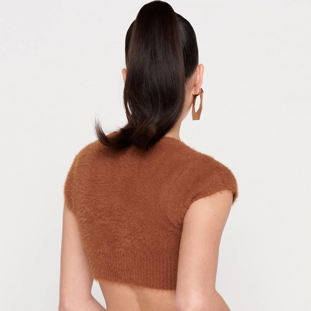 This fuzzy cardigan is cozy and unique. Made of soft acrylic and polyester fabric, embellished with a gold-tone letter hardware trimmed on the open front, featuring a fluffy relaxed fit cut structured with a scoop neckline, a short sleeve styling, and a cropped length accented with a bare midriff cut at the waist. Find more trendy women’s cardigans or fashionable clothing in our boutique, and pair it with a baguette bag, bold mules and high rise denim for a retro-inspired street look.