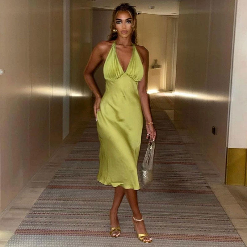 This silky satin dress looks eternally chic. Crafted with silky satin and polyester fabric, embellished with a halter tie trimmed with pleats on cups, featuring a flattering fit tailored with a concealed zip fastening at one side, an open back, and ended up with a mid-calf length. Find more unique women’s cocktail party dresses or trendy clothing in our boutique, and look just as good with party heels as it does with slides.