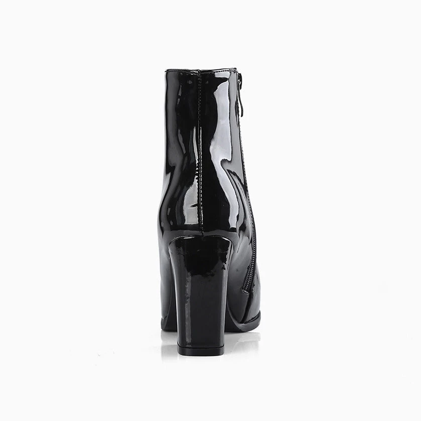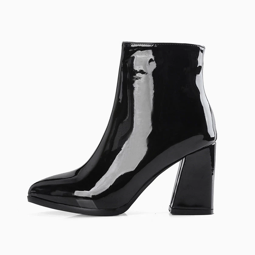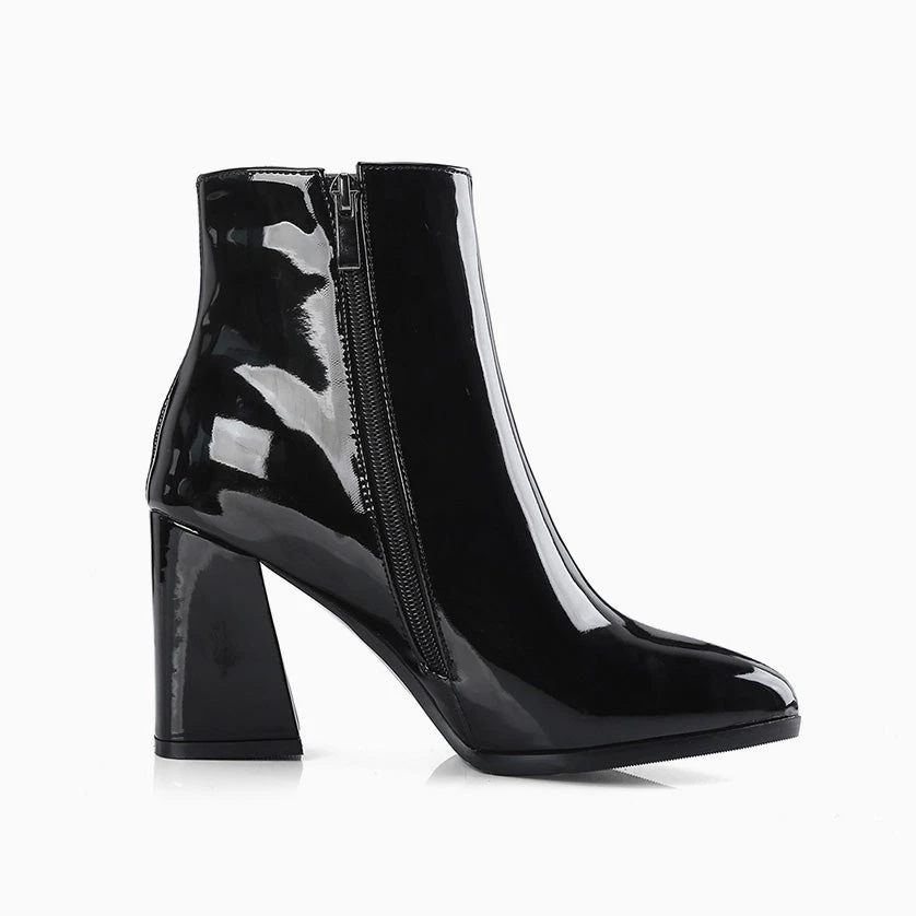 This pair of ankle boots adds a cool touch to your everyday wear. Crafted with PU enamel leather and rubber, stand out in high-shine vamp, featuring an ankle-height topline with zip fastening to one side, sharp pointed toes to the front, chunky heel along with rubber heel cap, and an anti-slip rubber outsole. Find more trendy women’s boots and unique shoes in our boutique, and pair the stylish boots with everything from cropped denim to dresses and skirts for a modern chic street look – Heel height: 8 cm.