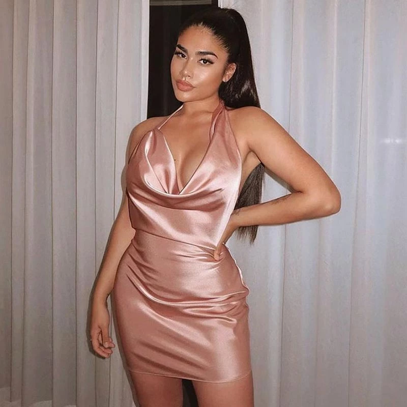 Show off your charming side in this silky satin dress. Crafted with polished satin fabric and polyester in solid color, stand out in a luxury-like glossy profile, featuring a draped cowl neckline with a halter strap, a pullover silhouette, a flattering cut hugging your curves like a glove, and ended up with a mini length. Find more unique women’s party dresses or trendy clothing in our boutique, and complete it with glittering statement earrings and high heels.