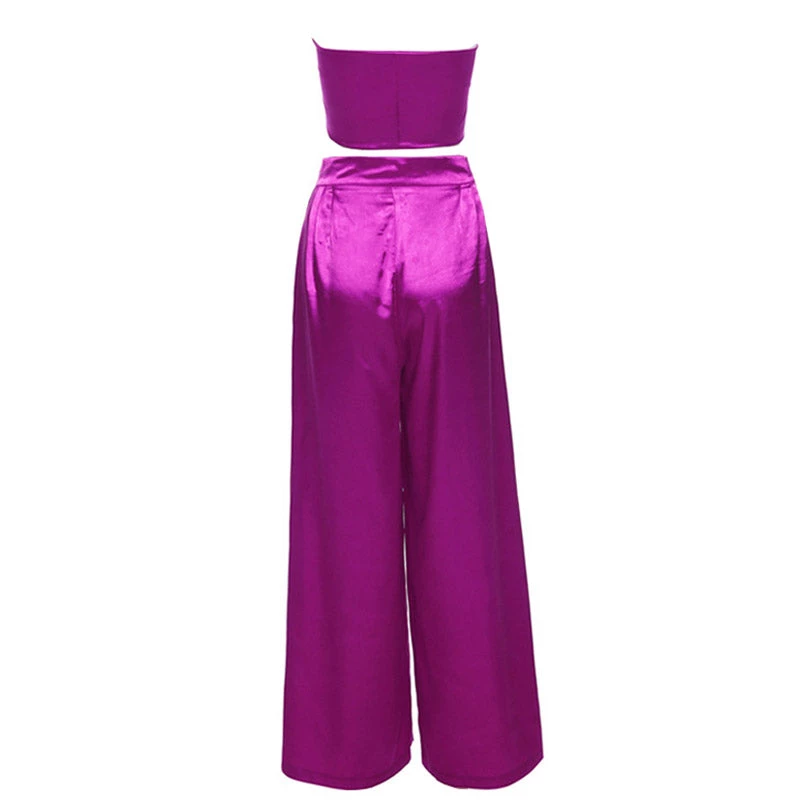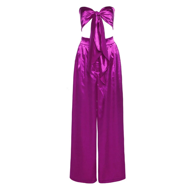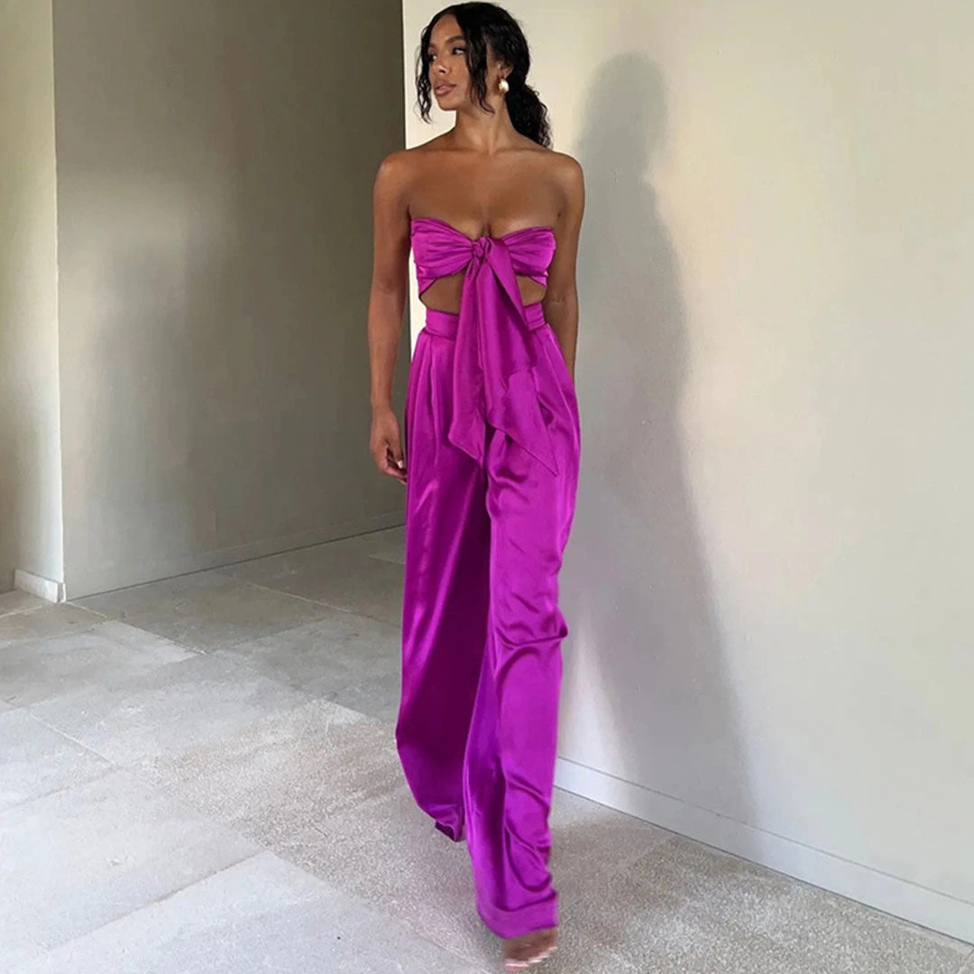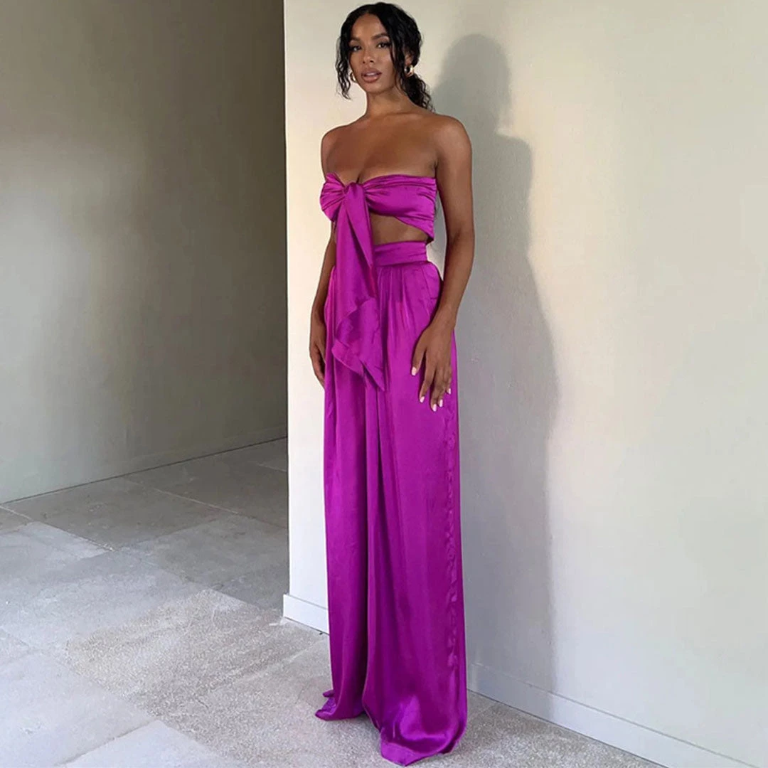 This bright-colored two-piece set is the one you want to wear over & over all summer long, and it will take you seamlessly from the street to the beach. Crafted with silky satin fabric, stand out in a vibrant neon colourway, featuring a playful self-tie strapless top in multi-ways, complete a leisure matching set with a pair of high rise pants accented with long, wide-cut legs. Find more trendy women’s matching sets or unique clothing in our boutique, and pair it with a cute basket bag and high heels for a vibrant outing look.