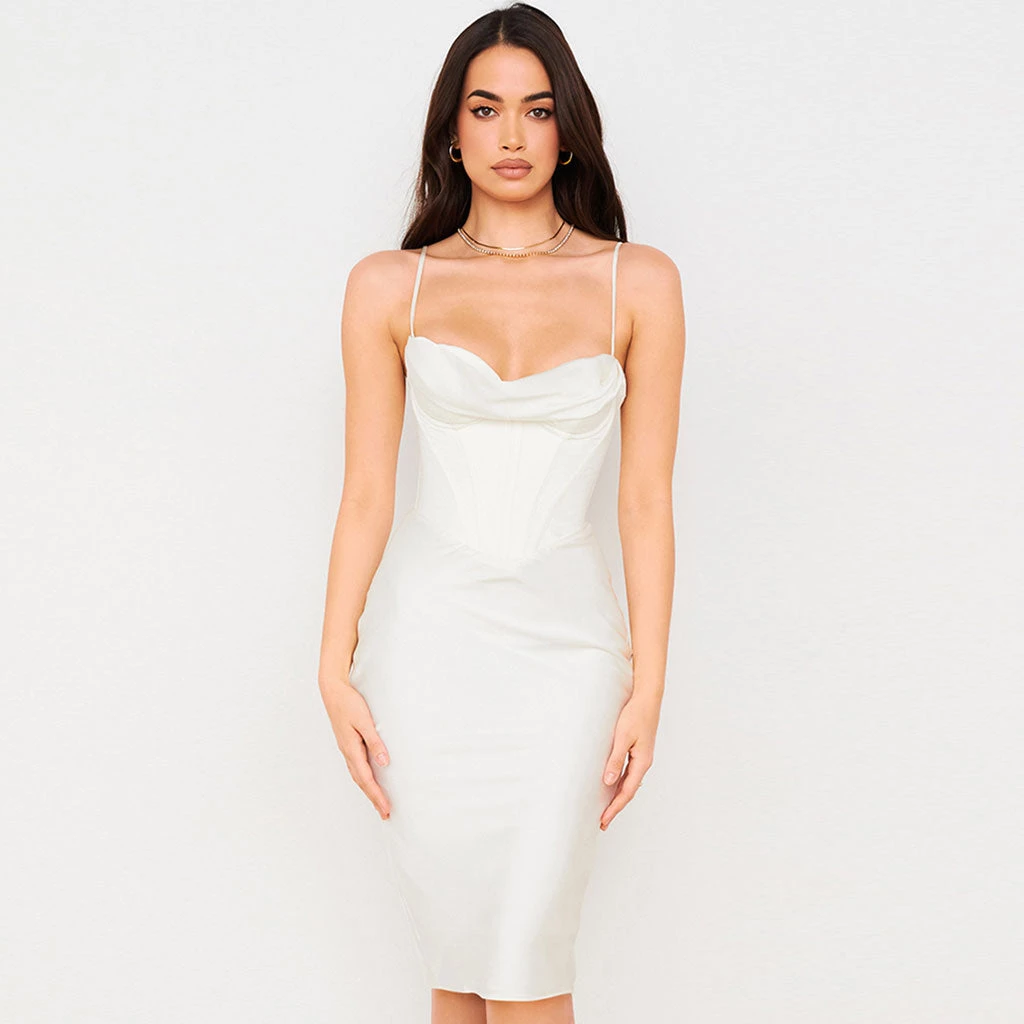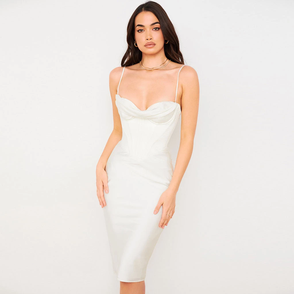 Trendy & Unique Glossy Satin Cowl Neck Underwire Bustier Corset Midi Dress – White