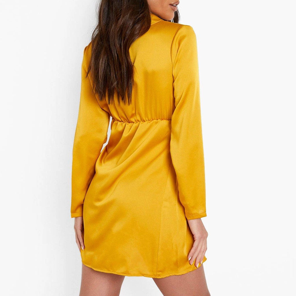 Keep it casual and glam in this silky satin dress. Crafted with lightweight satin and polyester in solid color, stand out in a self-tie bow trimmed with ruched details at the waist, featuring a point collar along with a plunging neckline, a buttoned placket structured with pleats at sides, long sleeves tailored with buttoned cuffs, and ended up with a mini length tailored with a curved hem. Find more unique women’s shirt dresses or trendy clothing in our boutique, and match it with metallic heels and statement accessories.