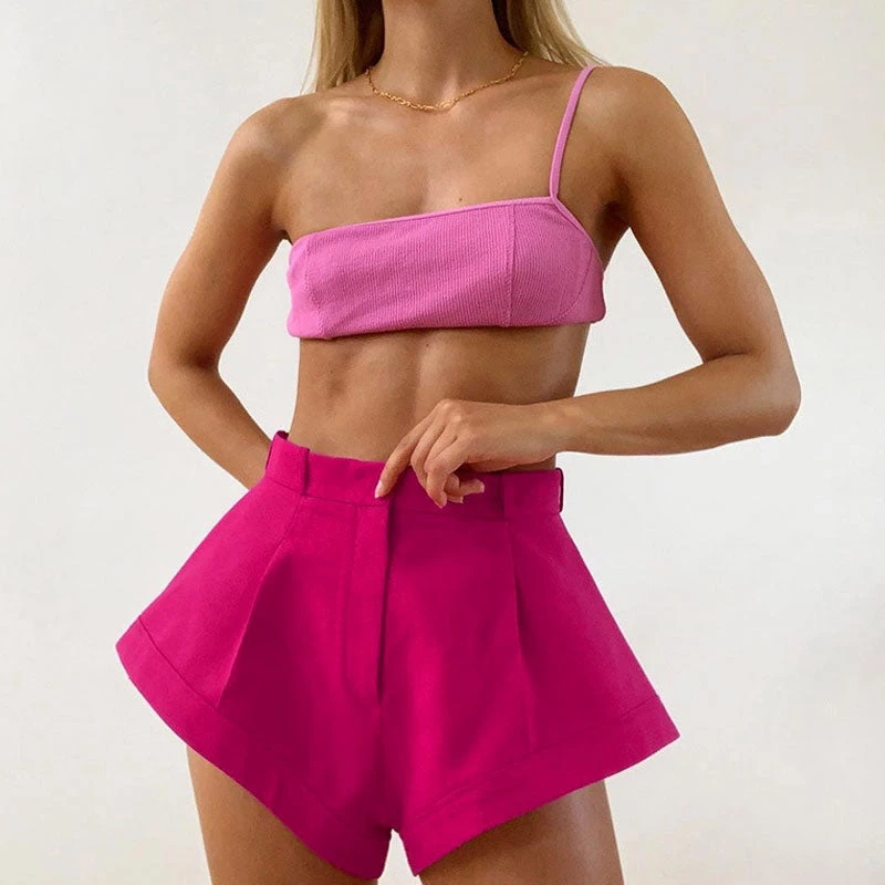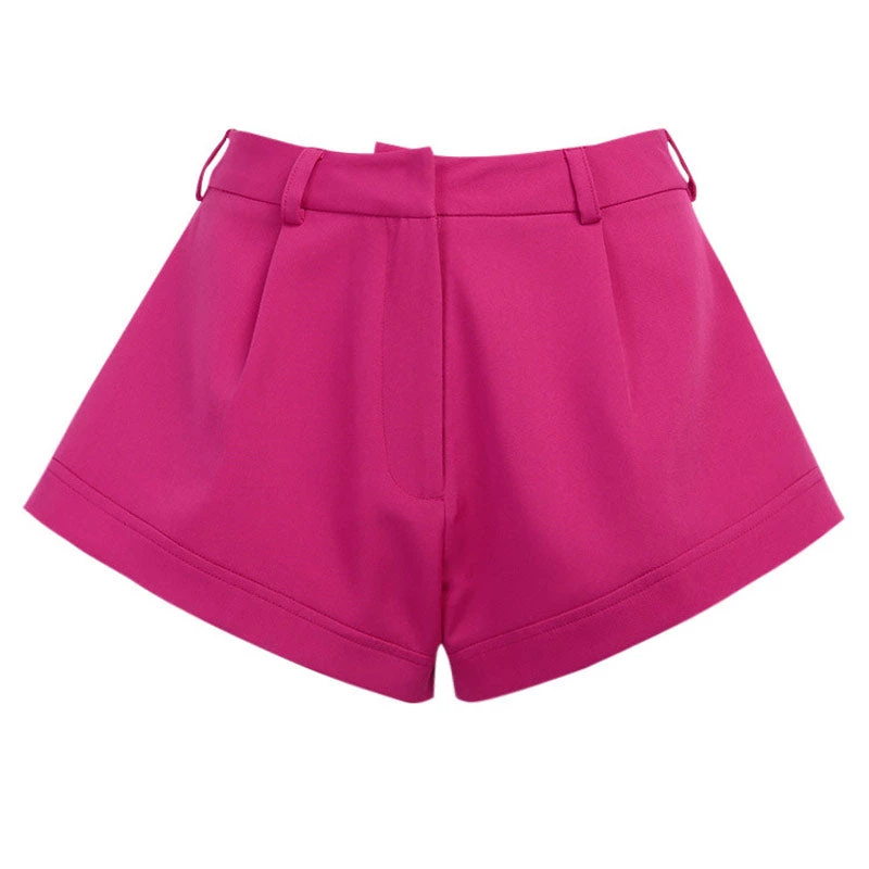 Elongate your legs with this pair of bright-color shorts. Made of cotton-blend and polyester, embellished with a bright-colored rose hue, featuring a high rise waistband trimmed with belt loops, a concealed zip fastening to the front, frill trims, and seamed wide-leg hems. Find more unique women’s shorts or trendy clothing in our boutique, and tuck in your favorite top and add a pair of chic Heels.
