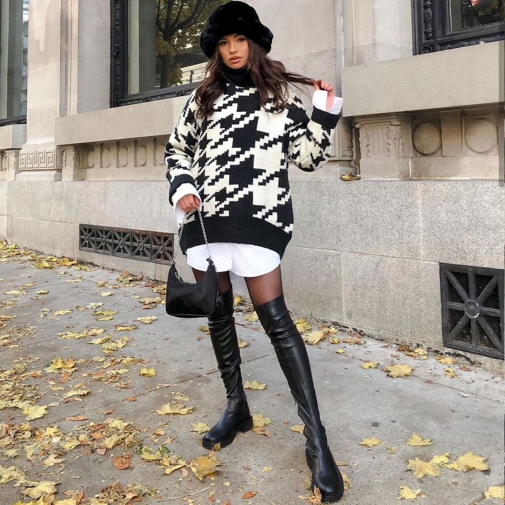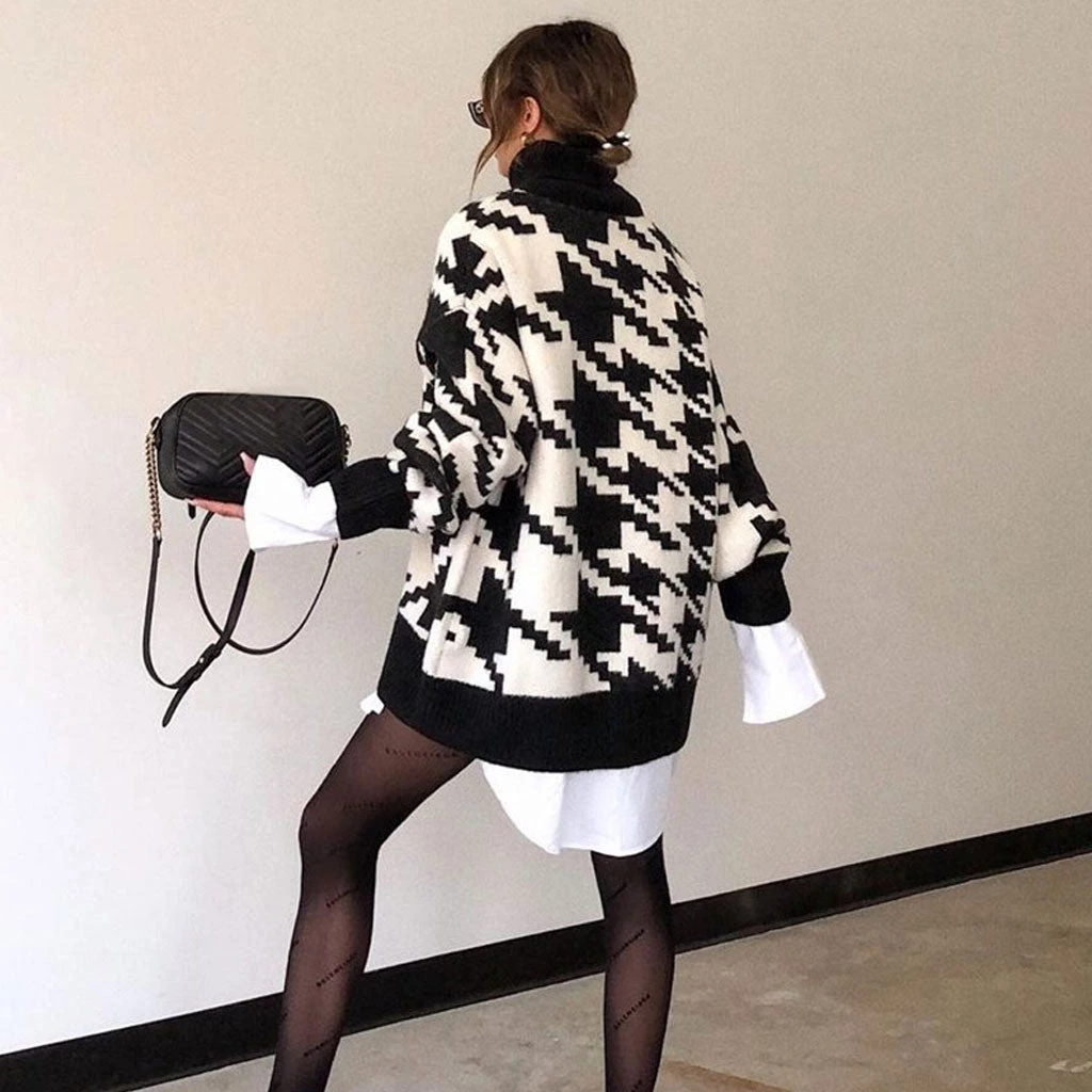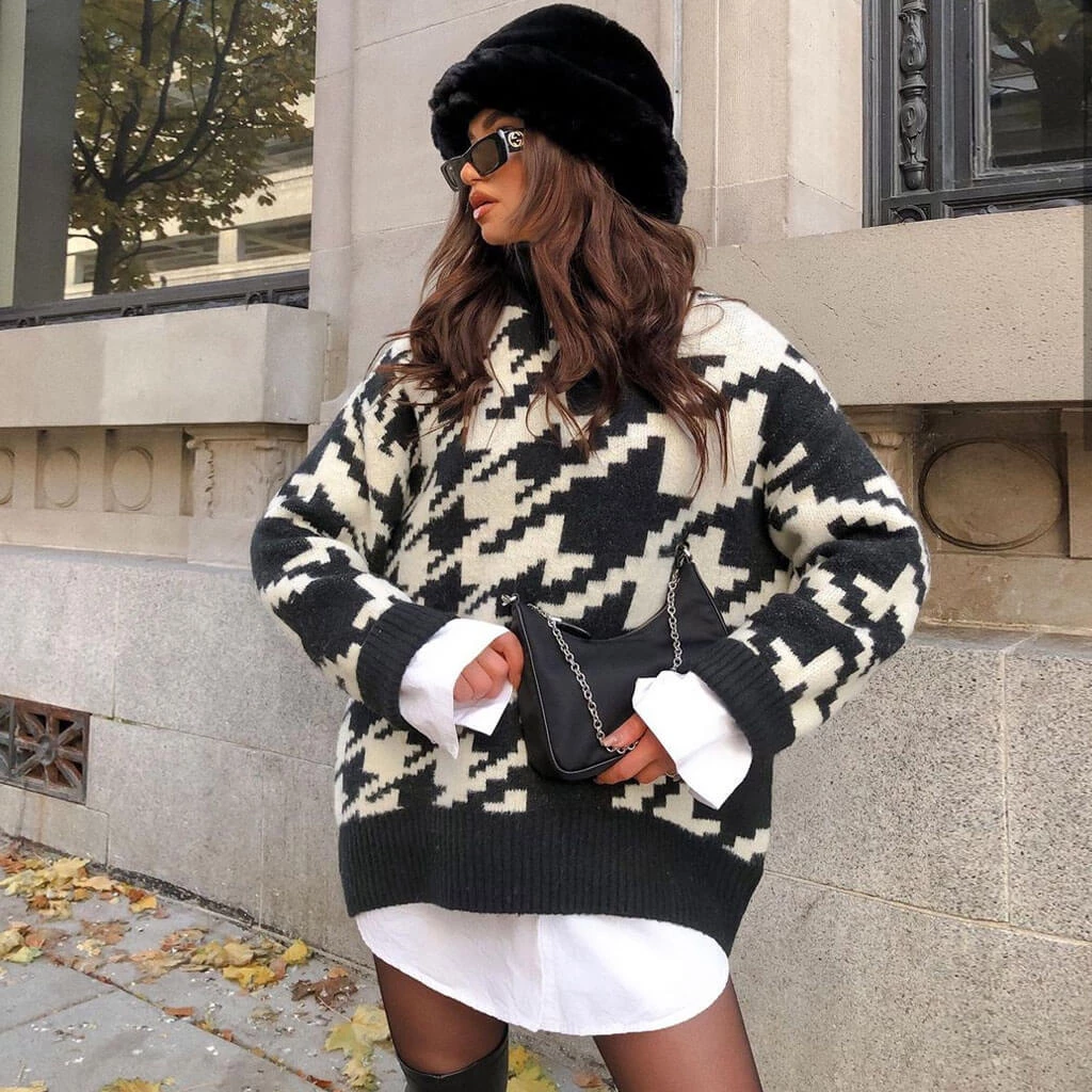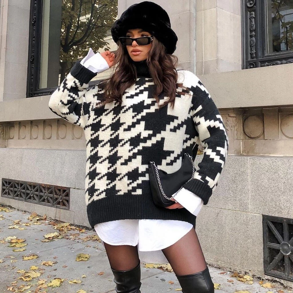 This classic knit top is an easy choice for autumn and winter. Made of jersey blend, stand out in color block geometric patterns throughout, featuring a roomy fit cut structured with a ribbed rolled collar, long sleeves trimmed with ribbed cuffs, and an elongated length trimmed with a ribbed hem. Find more unique women’s pullover sweaters or trendy clothing in our boutique, and simply team it with anything-depending on the look you want.