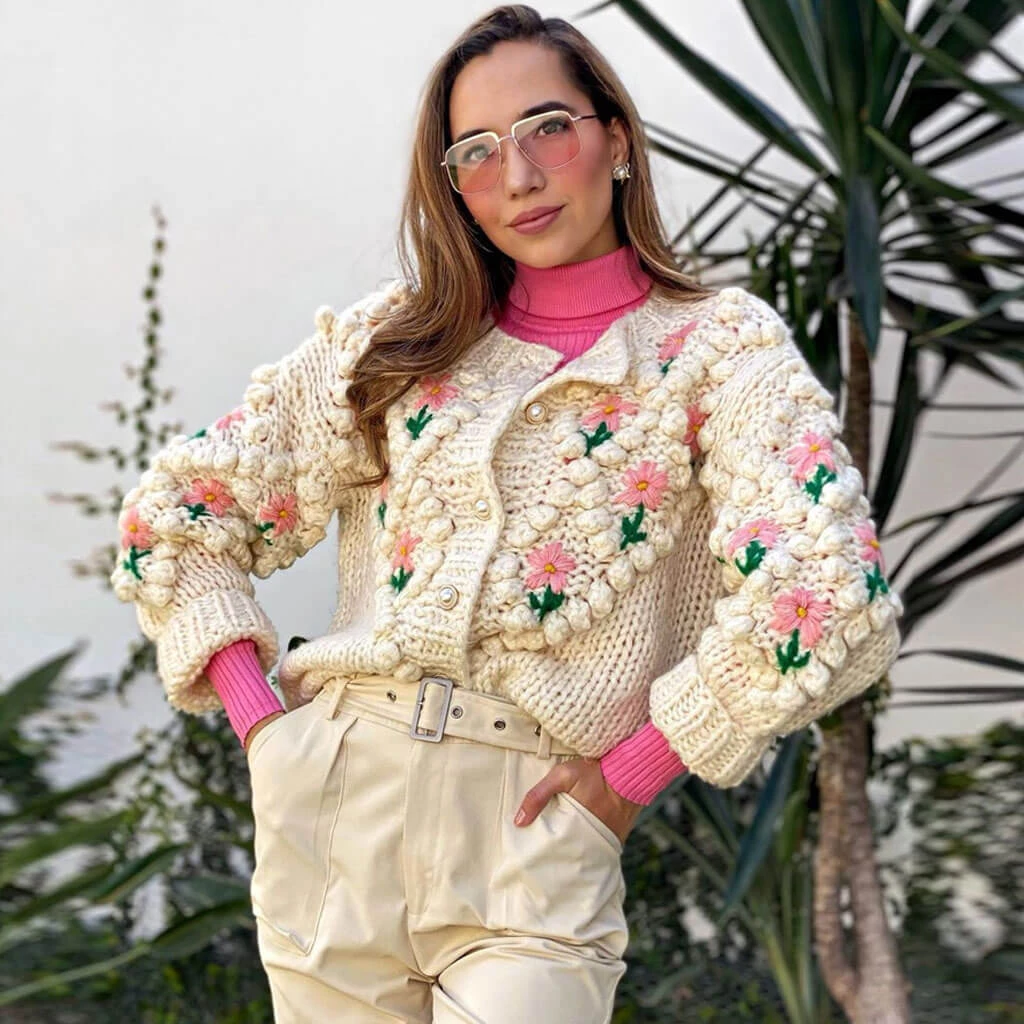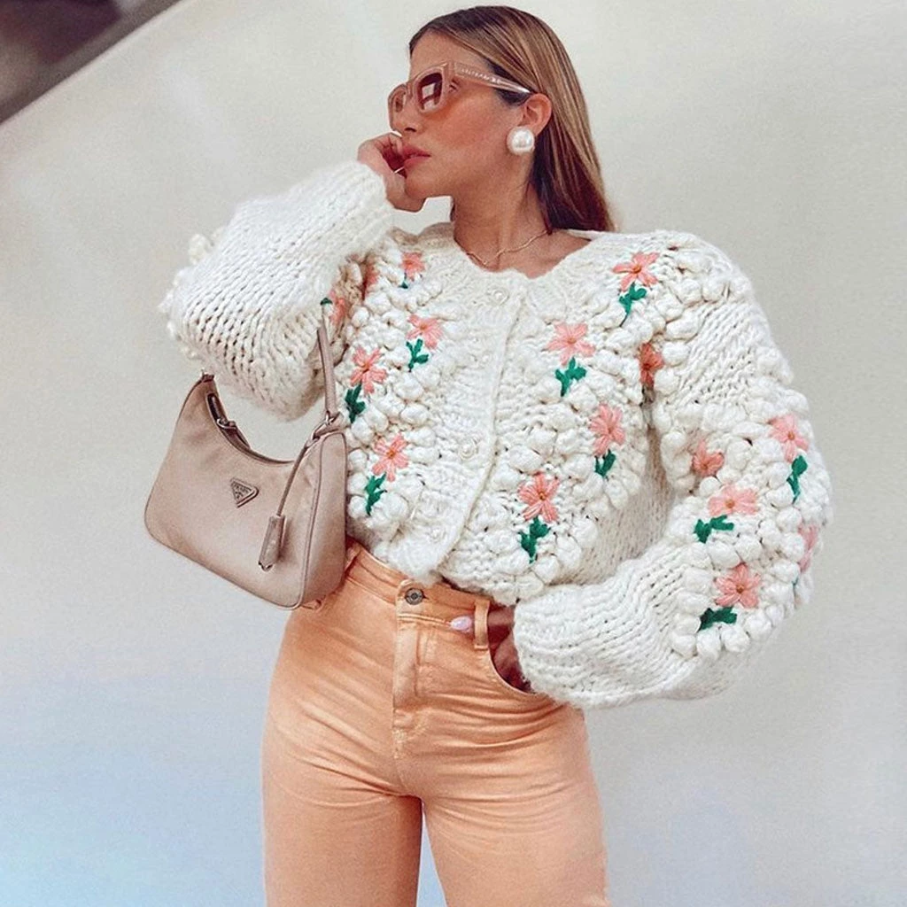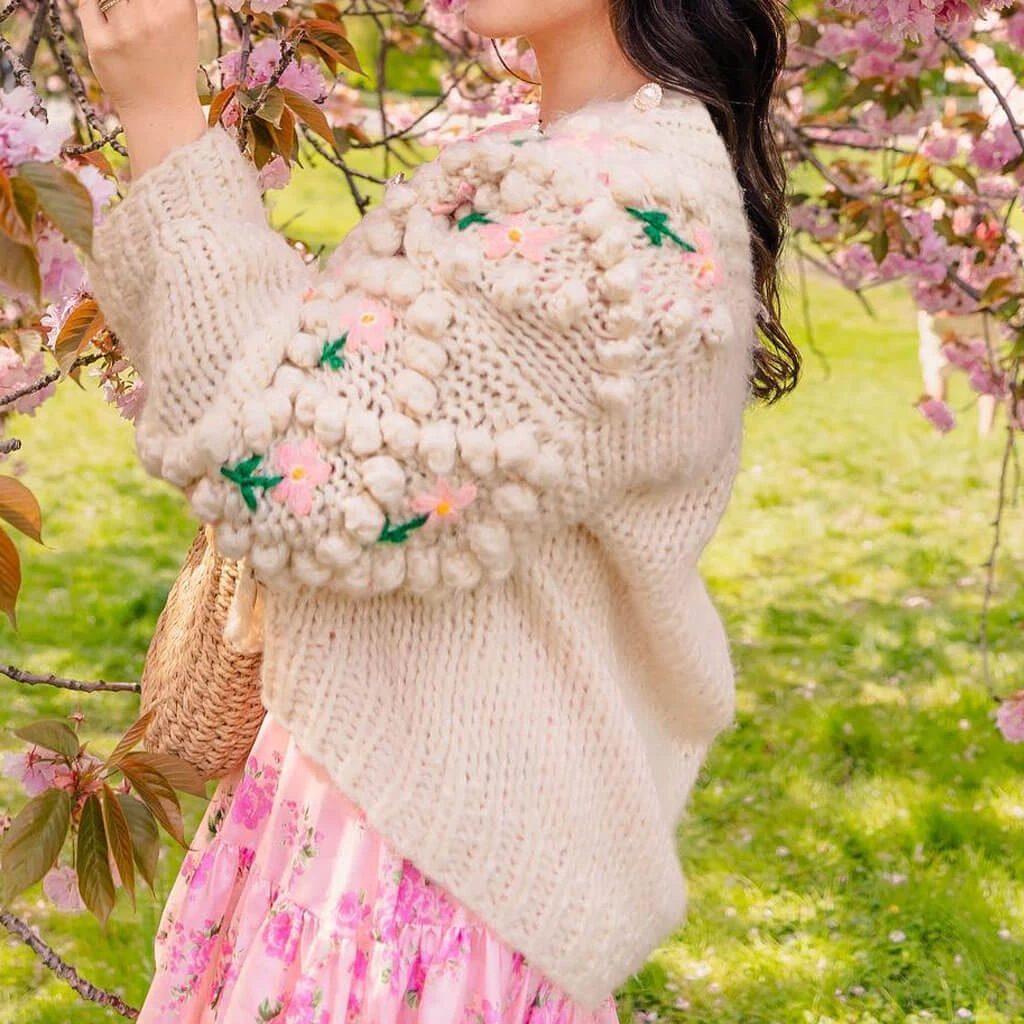 This adorable knit top is a perfect pick for romantic date. Crafted with blend acrylic and polyester, embellished with cute crochet flower in large area, featuring a boxy & roomy fit structured with pearl-like buttons front, a round neckline, blouson sleeves with dropped shoulders and ribbed cuffs, and ended up with a ribbed hem. Find more trendy women’s sweaters or unique clothing in our boutique, and layer it with everything-depending on the look you like.