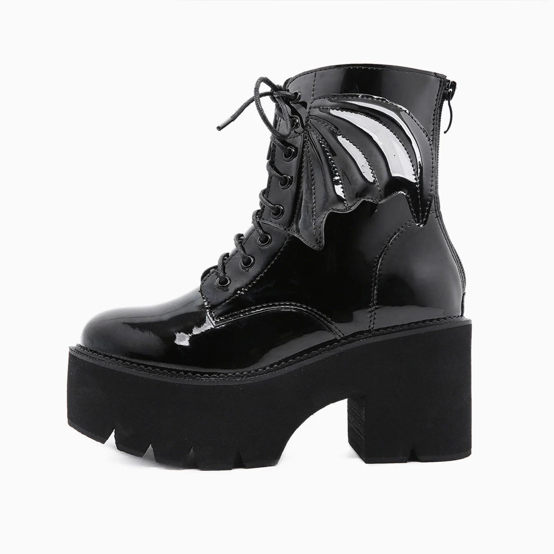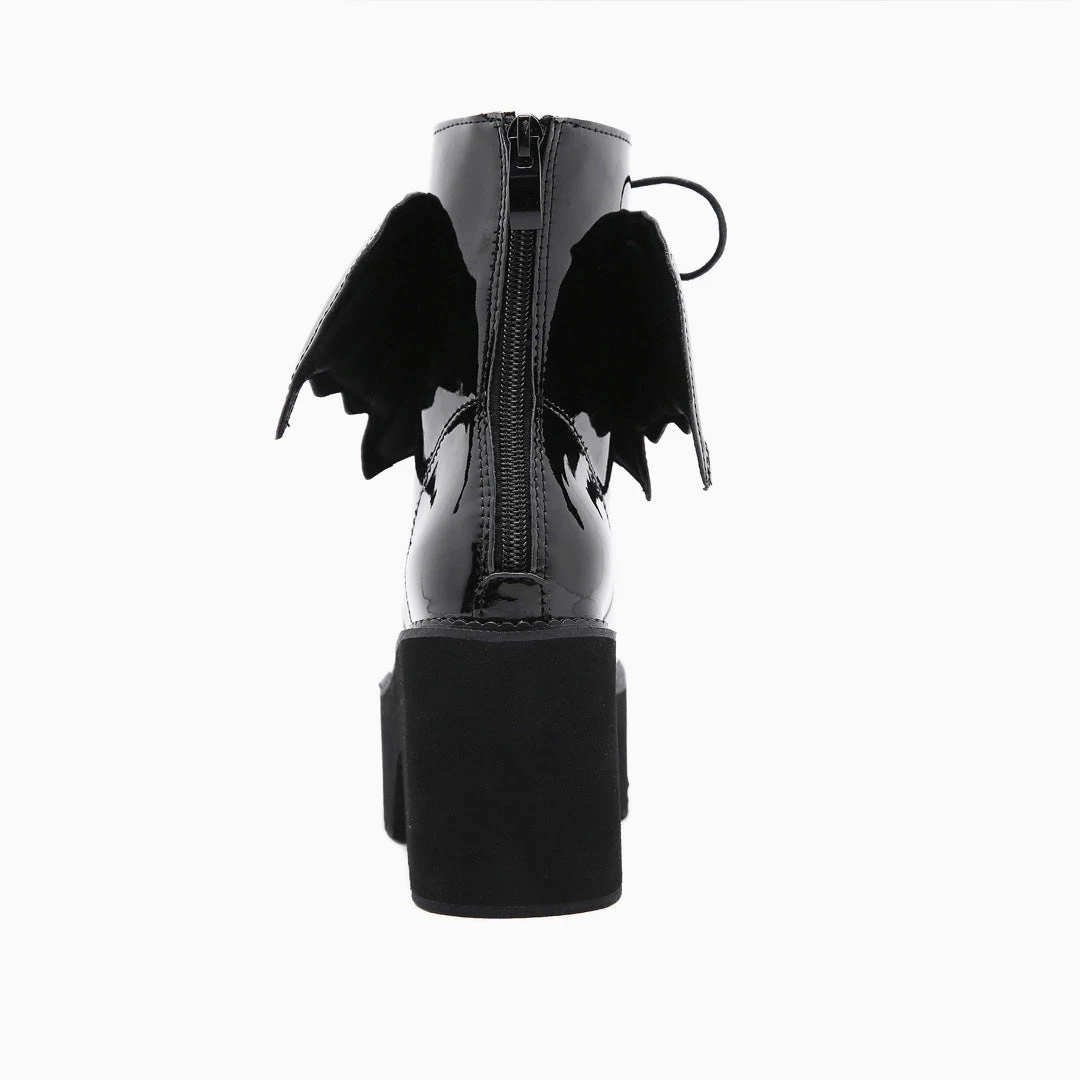 This pair of ankle boots adds a fun take to the classic block heel styling. Crafted with PU leather and rubber, embellished with flying wings to the sides, featuring an ankle-height topline tailored with a zip fastening to the rear, a round toe styling along with lace-up closure at the vamp, and grounded on extra thick, serrated lug rubber soles. Find more trendy women’s boots and unique shoes in our boutique, and go with crop-length jeans or skirts for a funny look – Heel height: 8.5 cm.