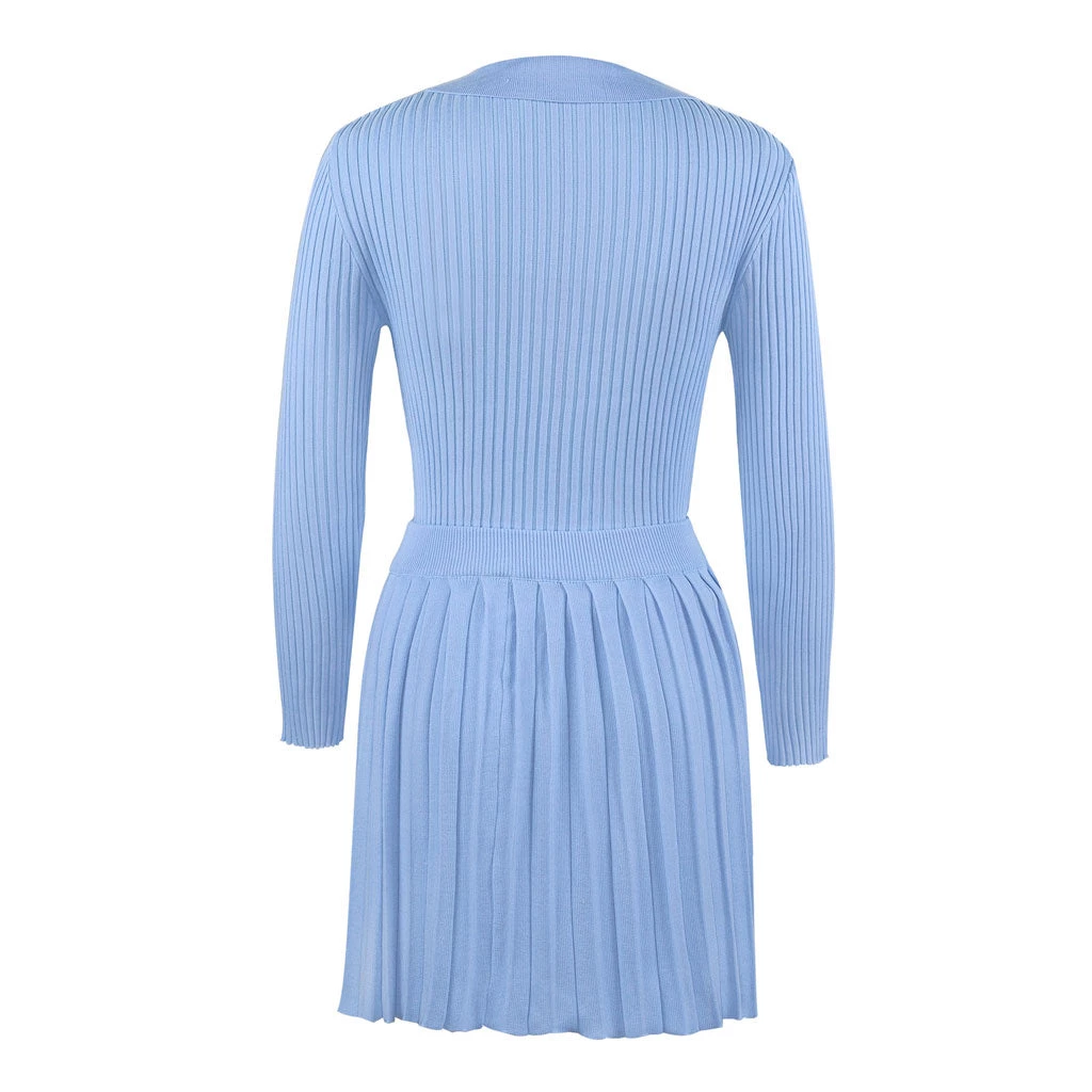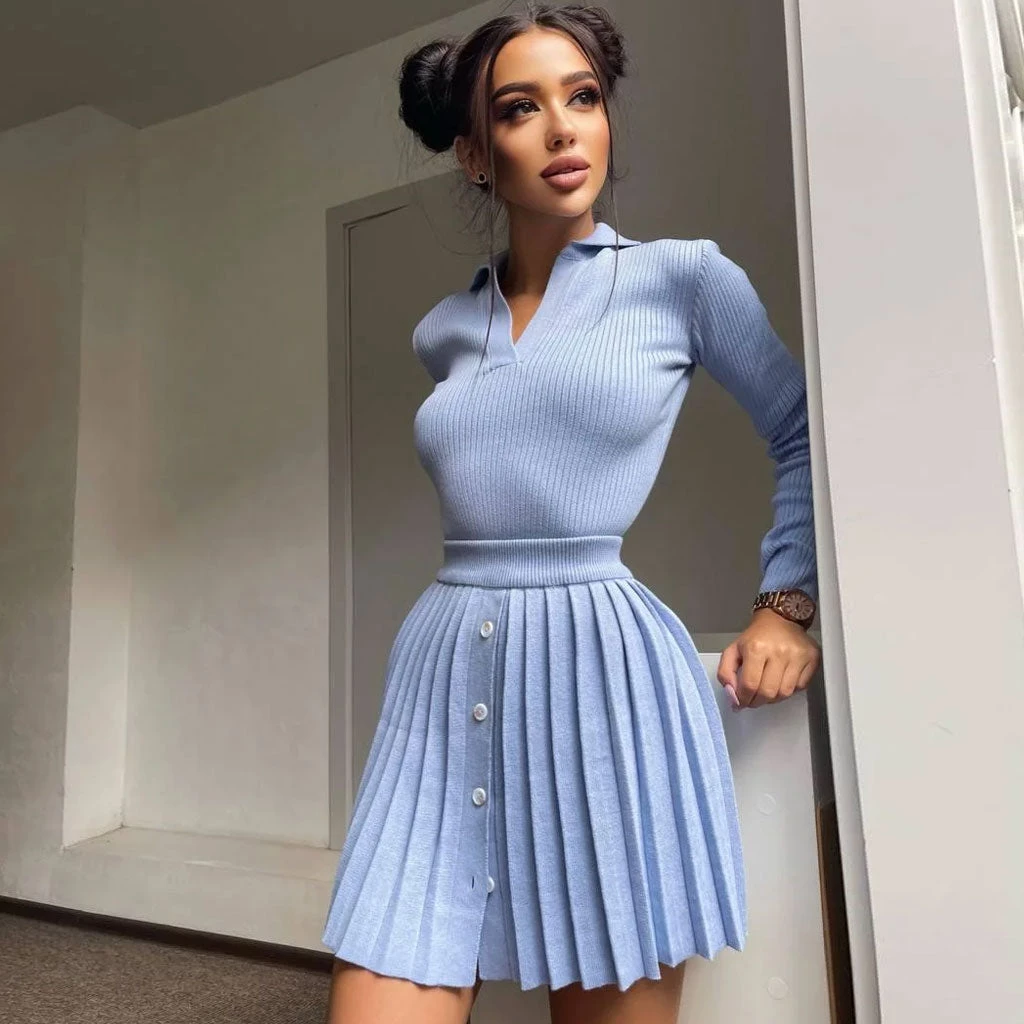 Trendy & Unique Preppy Rib Knit Collared Pleated Skirt Matching Set – Light Blue