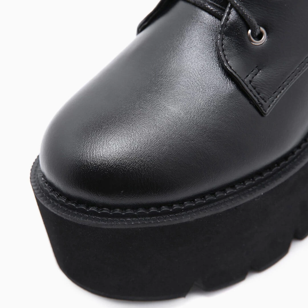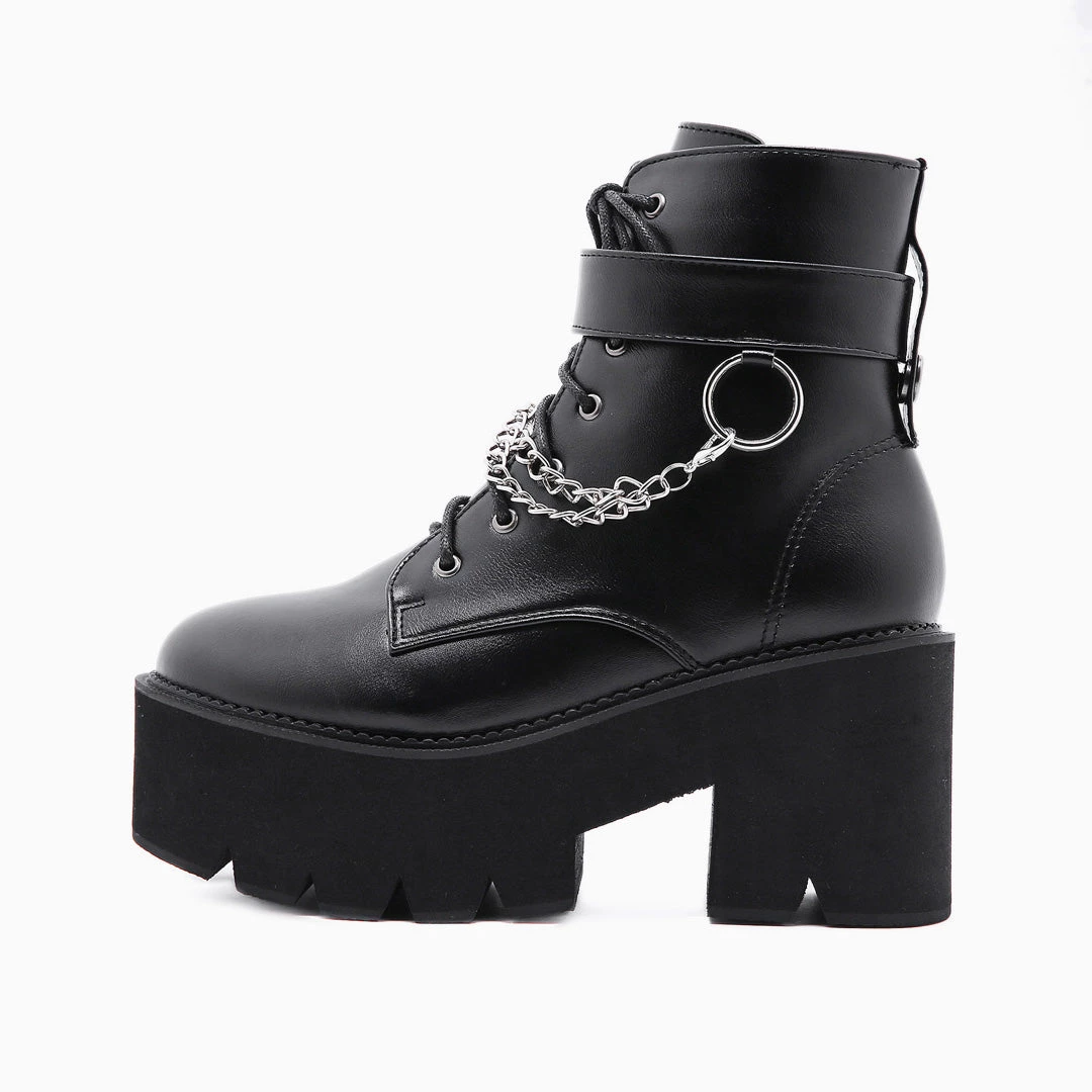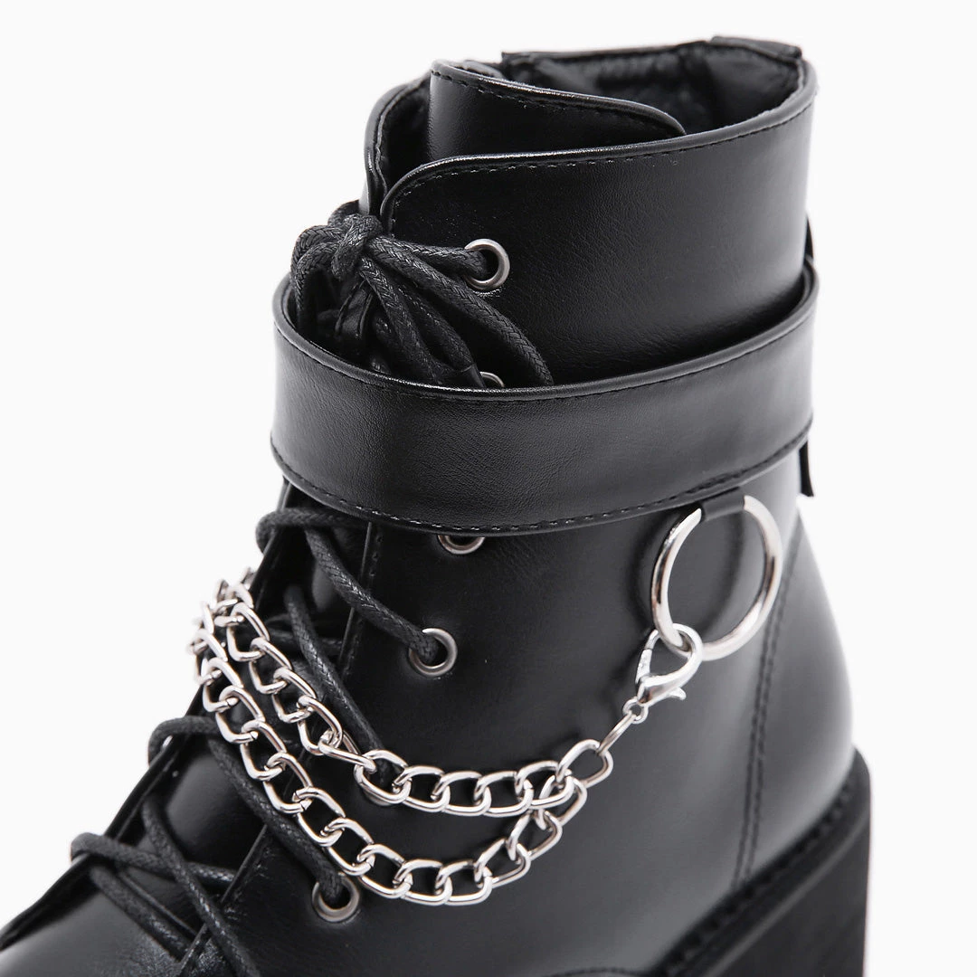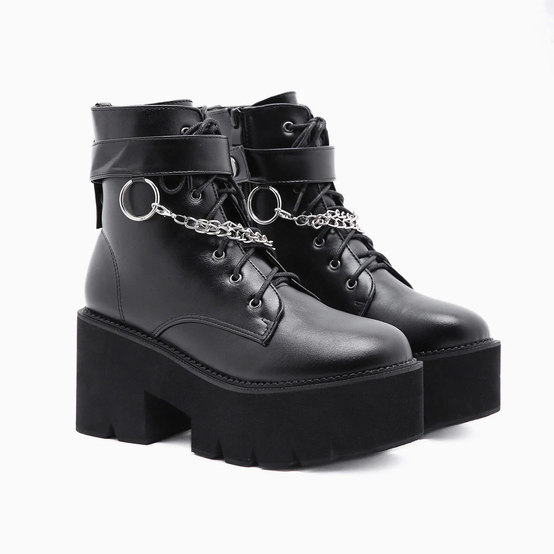 This pair of ankle boots strikes a rock-and-roll touch to your dull wintertime. Crafted with PU leather and rubber, embellished with a buckled strap trimmed with ring chains, featuring an ankle-height topline presented in solid black, lace-up detailing at the vamp trimmed with a zipped fastening to one side, round toe styling, and grounded on extra thick, serrated lug rubber soles. Find more unique women’s boots and trendy shoes in our boutique, and wear the stylish boots with slim pants, or don a sweet babydoll dress for a punk style street look – Heel height: 8 cm.