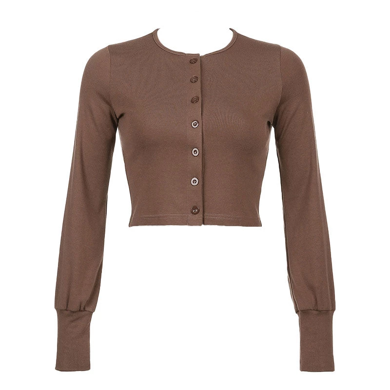 This cropped cardigan creates a retro vibe to your closet. Crafted with soft jersey fabric and spandex in solid color, stand out in a bare midriff cut at the waist, featuring a slim fit structured with a classic round neckline, a button placket to the front and a long sleeve styling. Find more unique women’s cardigans or trendy clothing in our boutique, and pair it with your favorite denim and sneakers for a casual street look.