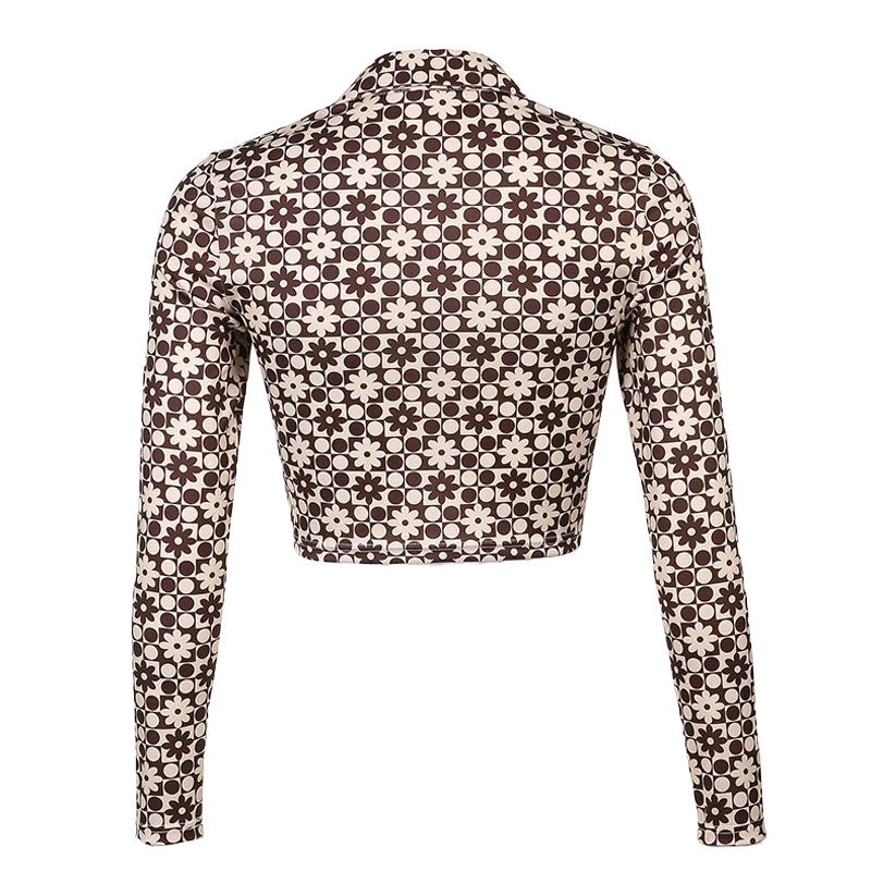 The crop button-down brings a retro vibe to your street look. Made of lightweight polyester fabric, embellished with geometric prints and flowers patterns throughout, featuring a slim fit cut along with a point collar, a button placket to the front, a long sleeve styling, and a cropped length accented with a bare midriff cut at the waist. Find more unique women’s crop tops or trendy clothing in our boutique, and style along with a brown baguette bag and a pair of denim.